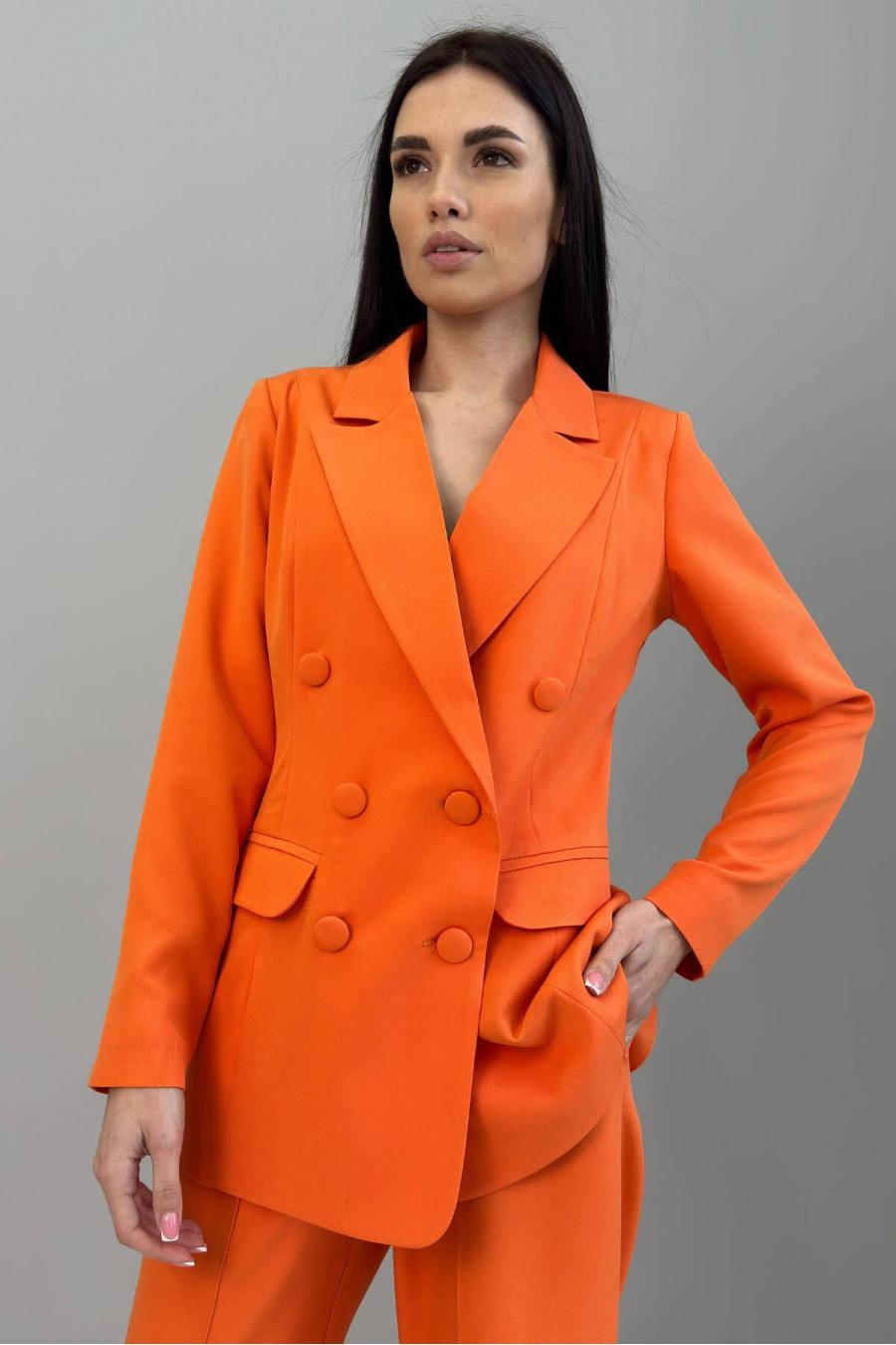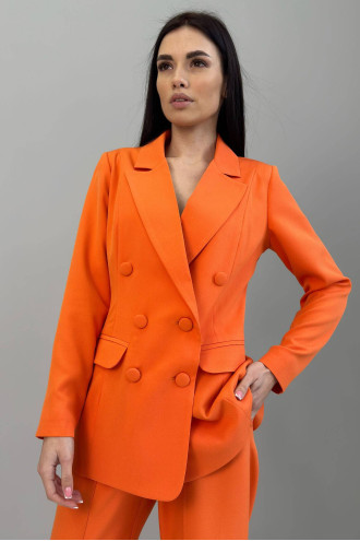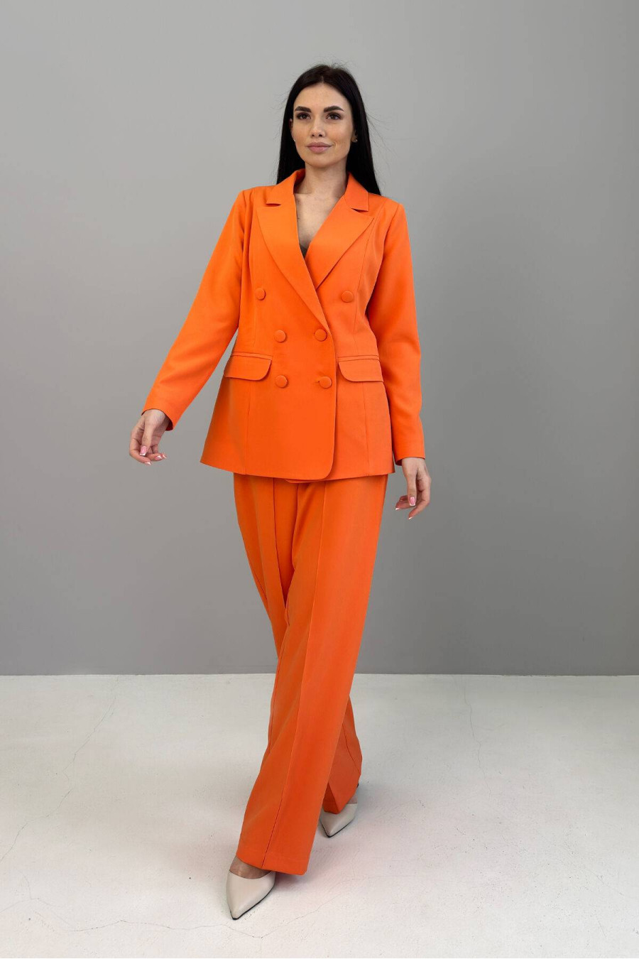 Classic straight-cut orange trousers are an accent, but at the same time discreet element of the wardrobe. Made of suit fabric, which is dense, does not shine through, almost does not wrinkle, thanks to which the trousers look neat throughout the day. They have a high fit, fasten with a button and zipper, and there is an elastic band on the back of the waist, which gently adjusts to the figure and adds even more comfort. They have a clear straight silhouette, which forms a neat, structured look. The bright orange color will add spring mood to the image, a feeling of warmth and freshness.
