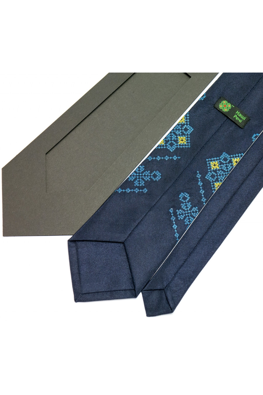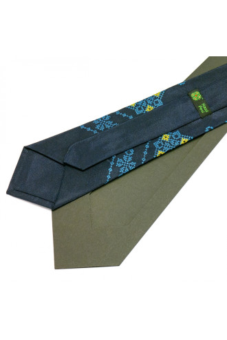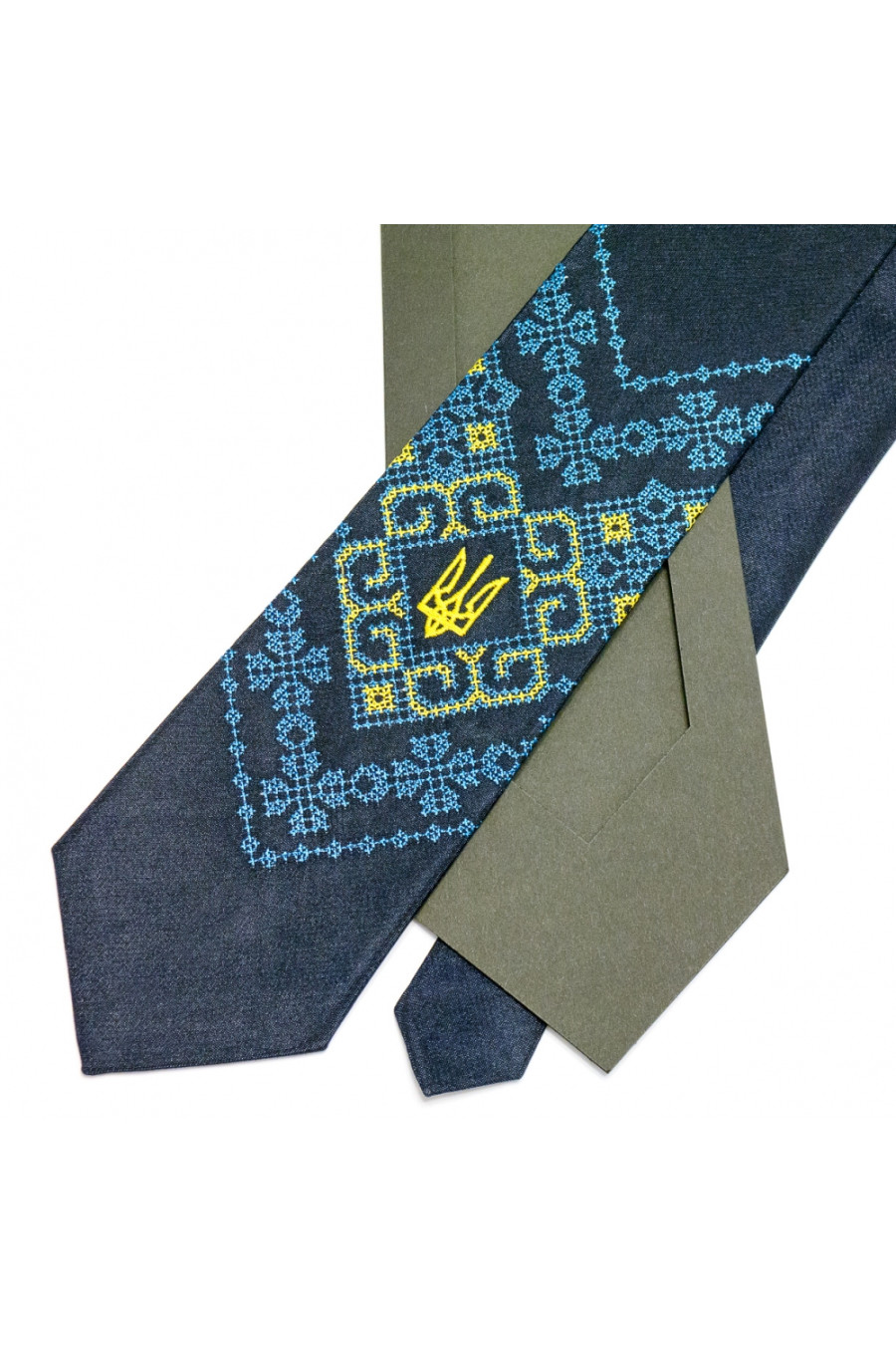 Синий фон для изделия выбран не случайно, на нем прекрасно смотрится желто-голубой орнамент крестиком, а тризуб не оставляет сомнений о этнической принадлежности. Обратите внимание на эксклюзивную упаковку. Она изготовлена вручную из черного дизайнерского картона. В такой упаковке не только удобно дарить галстук, но и брать с собой в поездки.