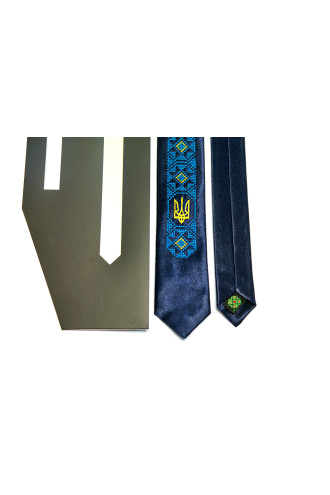 Узкий галстук «Фонтан» из сатина с вышивкой - это оригинальный украинский сувенир и отличный подарок. Галстук подойдет как для мужчин, так и для женщин. На синем фоне красиво выглядит качественный орнамент, вышитый голубыми и желтыми нитками.Обратите внимание на эксклюзивную упаковку. Она изготовлена вручную из черного дизайнерского картона. В такой упаковке не только удобно дарить галстук, но и брать с собой в поездки.