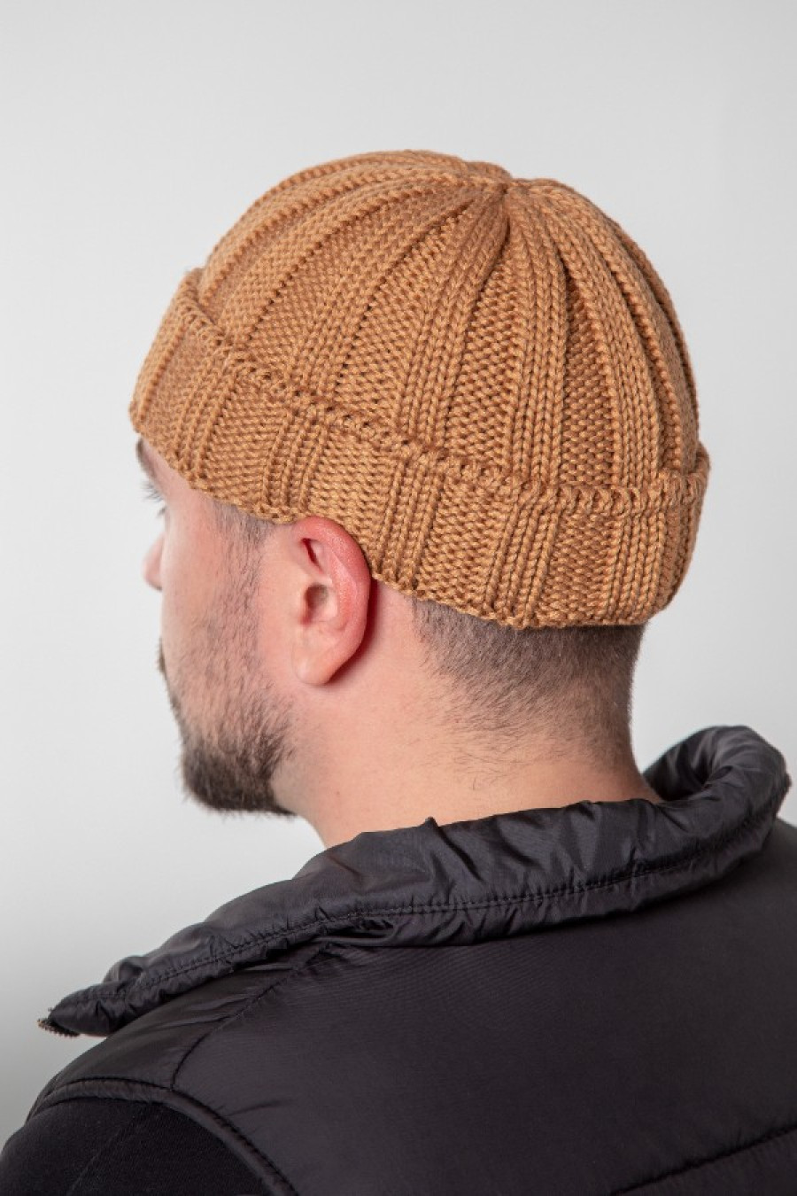 Оригинальная мужская вязаная демисезонная шапка мини-бини из теплой смессовой хлопковой пряжи карамельно-терракотового цвета с эластичным узором-резинкой, которая дополнит трендовый образ. Модель прилегающего фасона без подкладки с широким отворотом-резинкой. Шапка дополнит мужской повседневный гардероб и подойдет как к верхней одежде в классически-деловом стиле, так и к спортивным моделям.