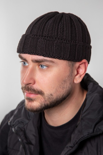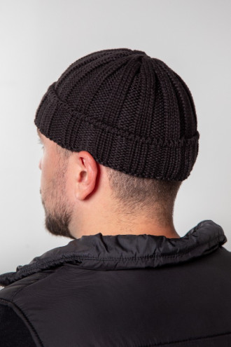Трендовая демисезонная мужская вязаная шапка мини-бини из теплой смессовой хлопковой пряжи черного цвета с эластичным узором-резинкой, которая придаст образу стильность и сдержанность. Модель прилегающего фасона без подкладки с широким отворотом-резинкой. Шапка дополнит мужской повседневный гардероб и подойдет как к верхней одежде в классически-деловом стиле, так и к спортивным моделям.