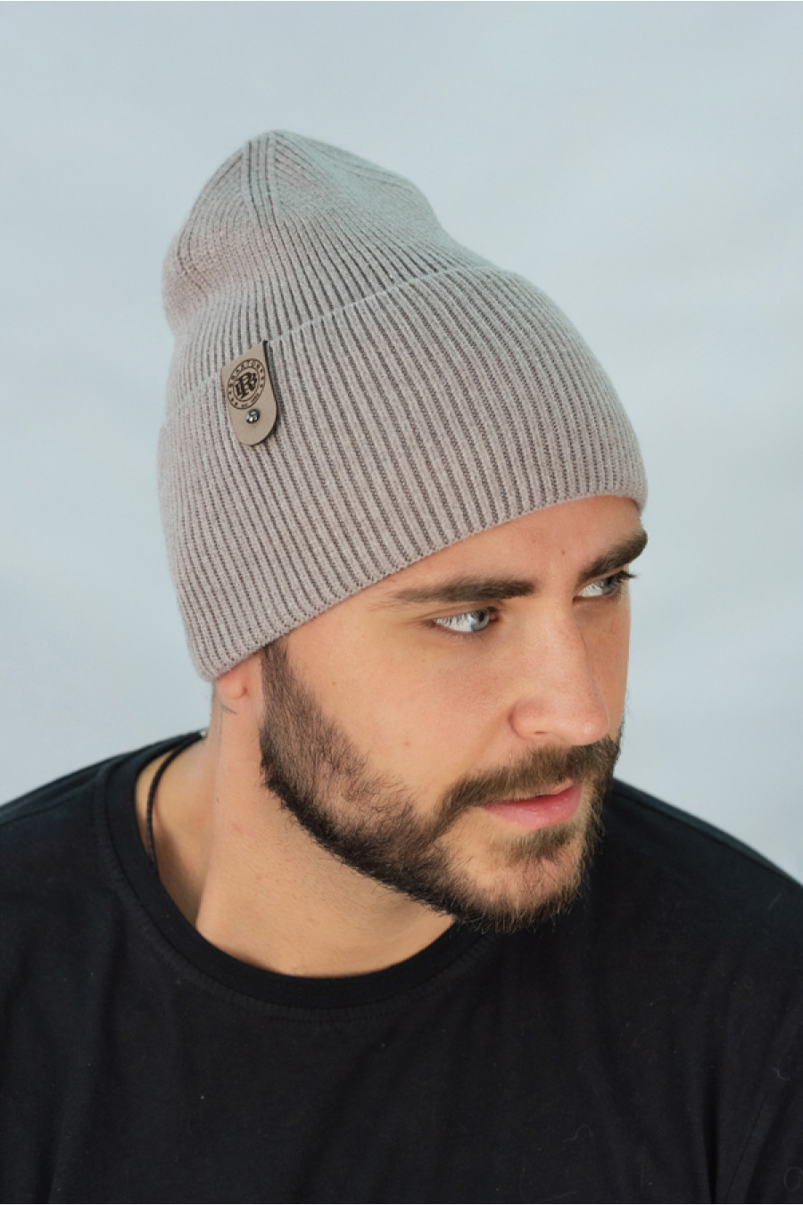 Мужская демисезонная однослойная вязаная шапка-колпак из приятной на ощупь смессовой пряжи кофейно-бежевого цвета с узором-резинкой. Модель классического фасона без подкладки с широким отворотом-резинкой и небольшим брендированным лейбом-декором. Шапка украсит мужской образ, подарит ощущение тепла в межсезонье и удачно сочетается с разнообразными вариантами верхней одежды из вашего гардероба.