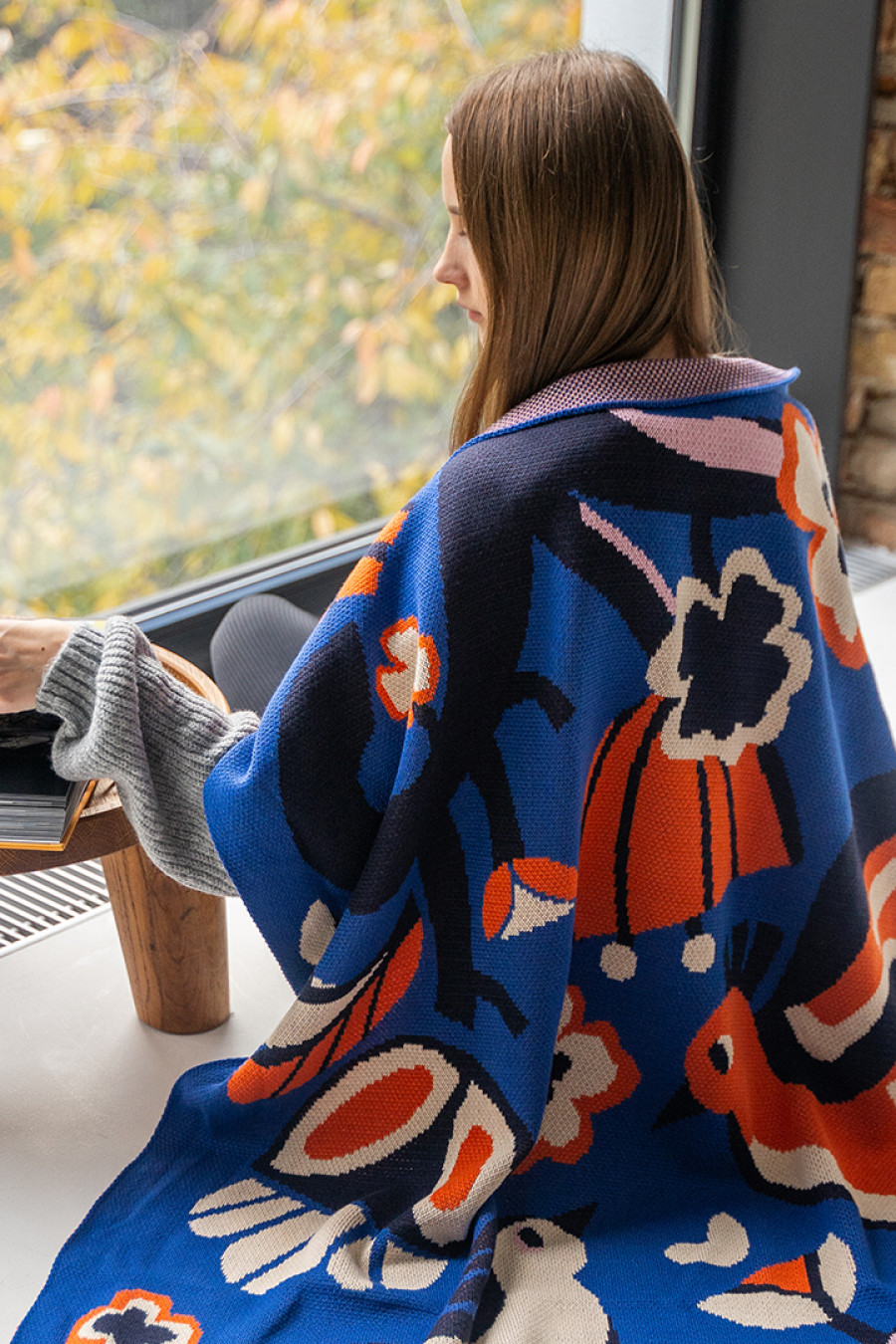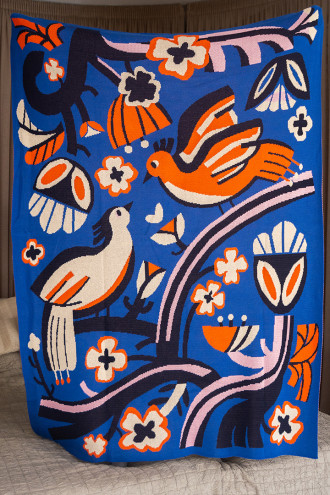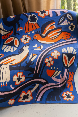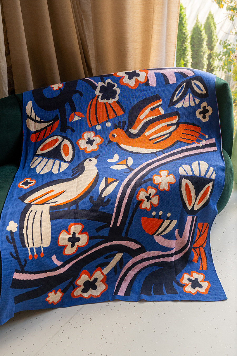 Удобный вязаный плед из мягкой смессовой пряжи насыщенного синего цвета с узором-картиной: стилизированный орнамент со сказочными птичками, сидящими на цветущем дереве. Изделие придаст интерьеру изысканность и этничность, подарит приятное ощущение "отчего дома" даже если вы за тысячу километров от родных пенатов. В него так удобно завернуться и хоть на мгноевение забыть о невзгодах и ненастье за окном. Плед станет удачным подарком к праздникам или сувениром для любителей украинских традиций.