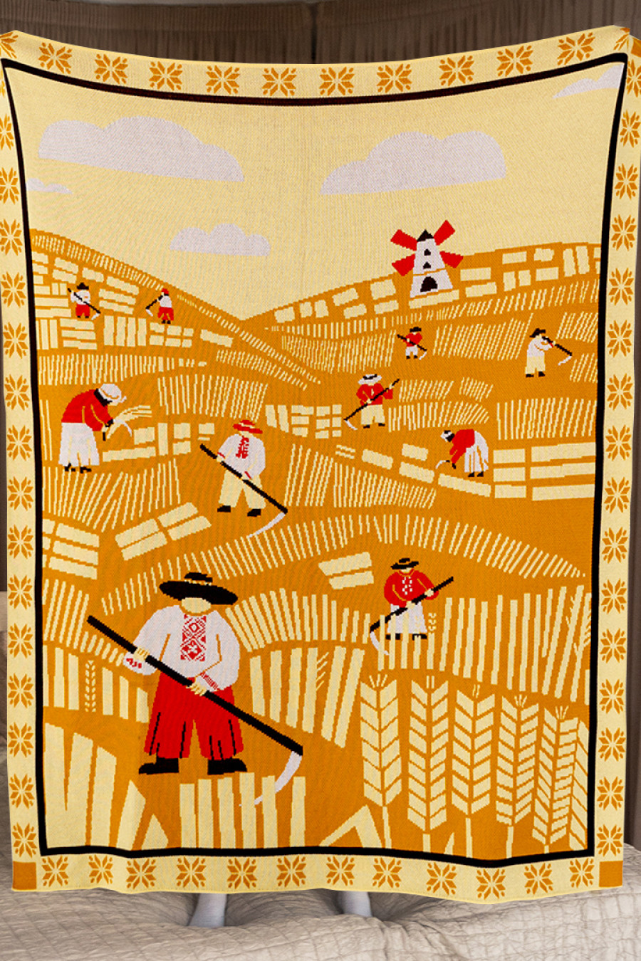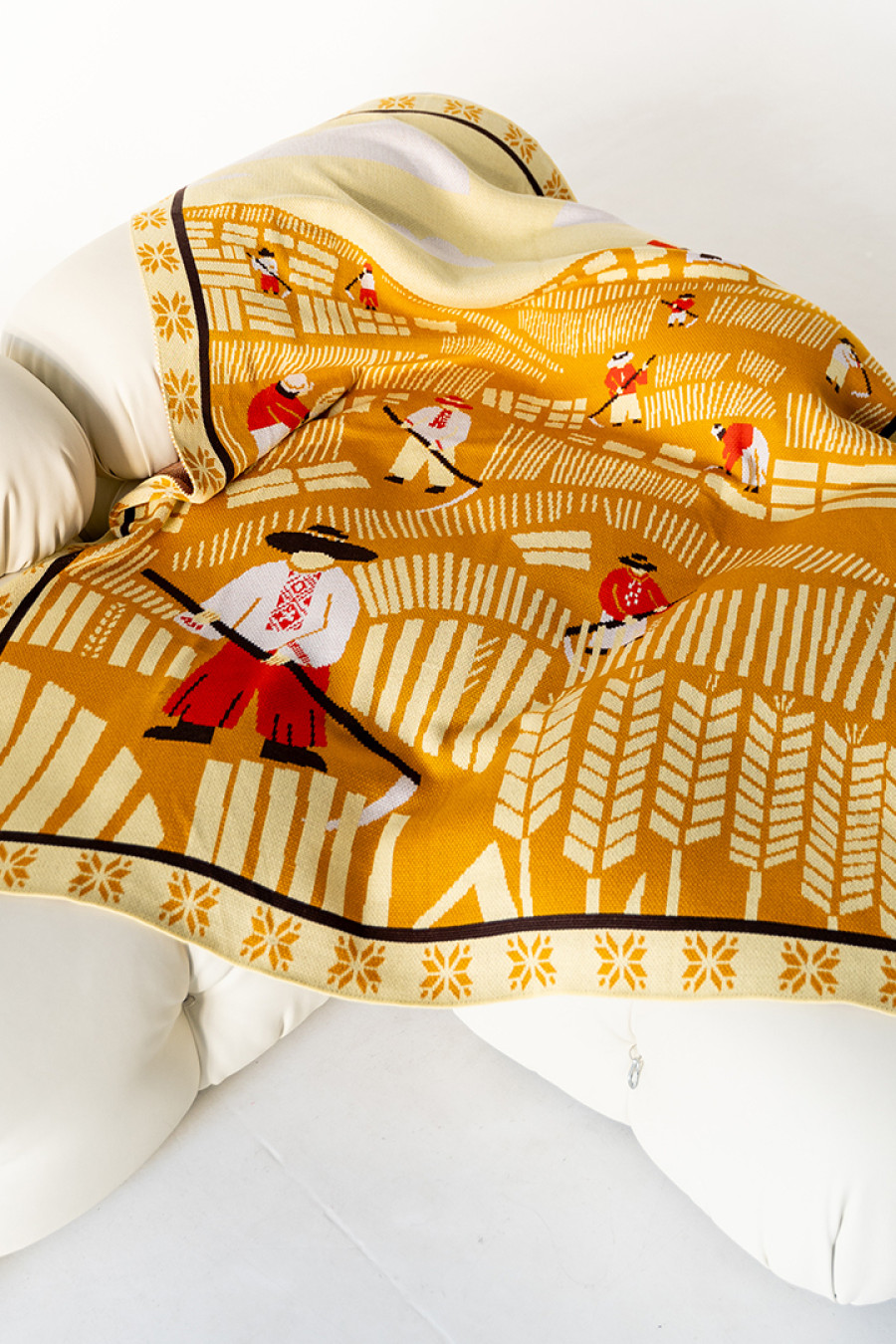 Нежный вязаный бежево-песочный плед из мягкой смессовой пряжи с узором-картиной: косари, собирающие урожай пшеницы, женщины, вяжущие снопы, небольшая мельница и геометрический орнамент-обрамление. Изделие придаст интерьеру изысканность и этничность, подарит приятное ощущение "отчего дома" даже если вы за тысячу километров от родных пенатов. В него так удобно завернуться и хоть на мгновение забыть о невзгодах и ненастье за окном. Плед станет удачным подарком к праздникам или сувениром для любителей украинских традиций.