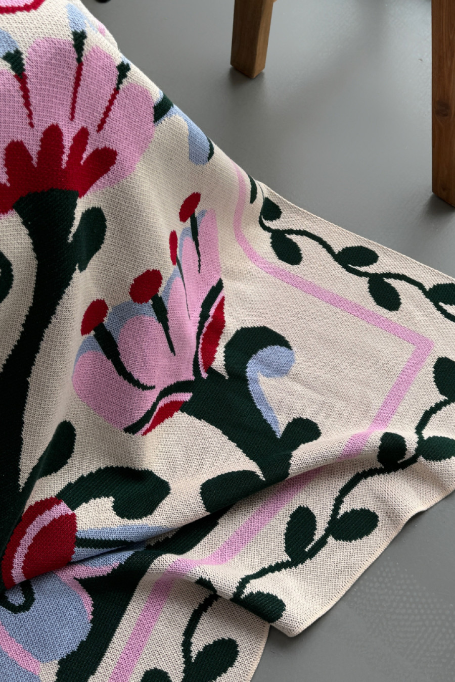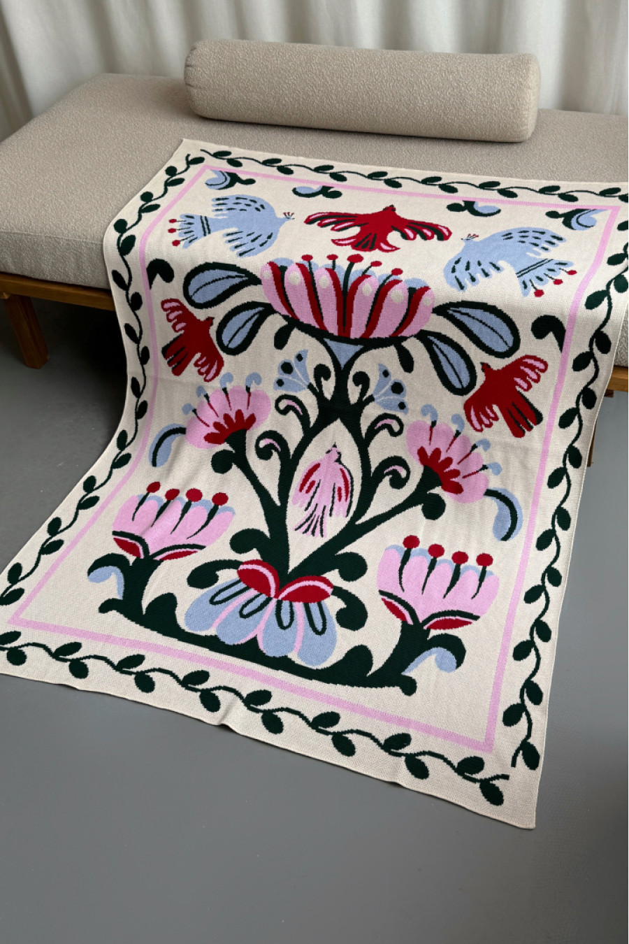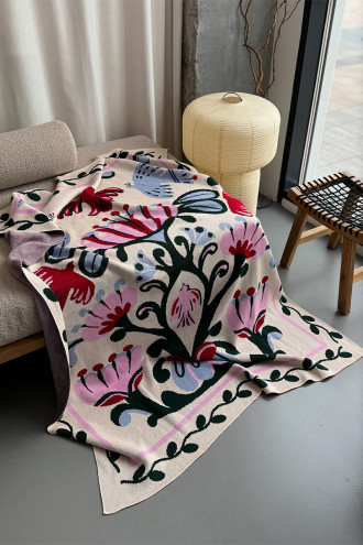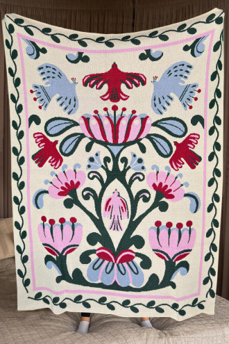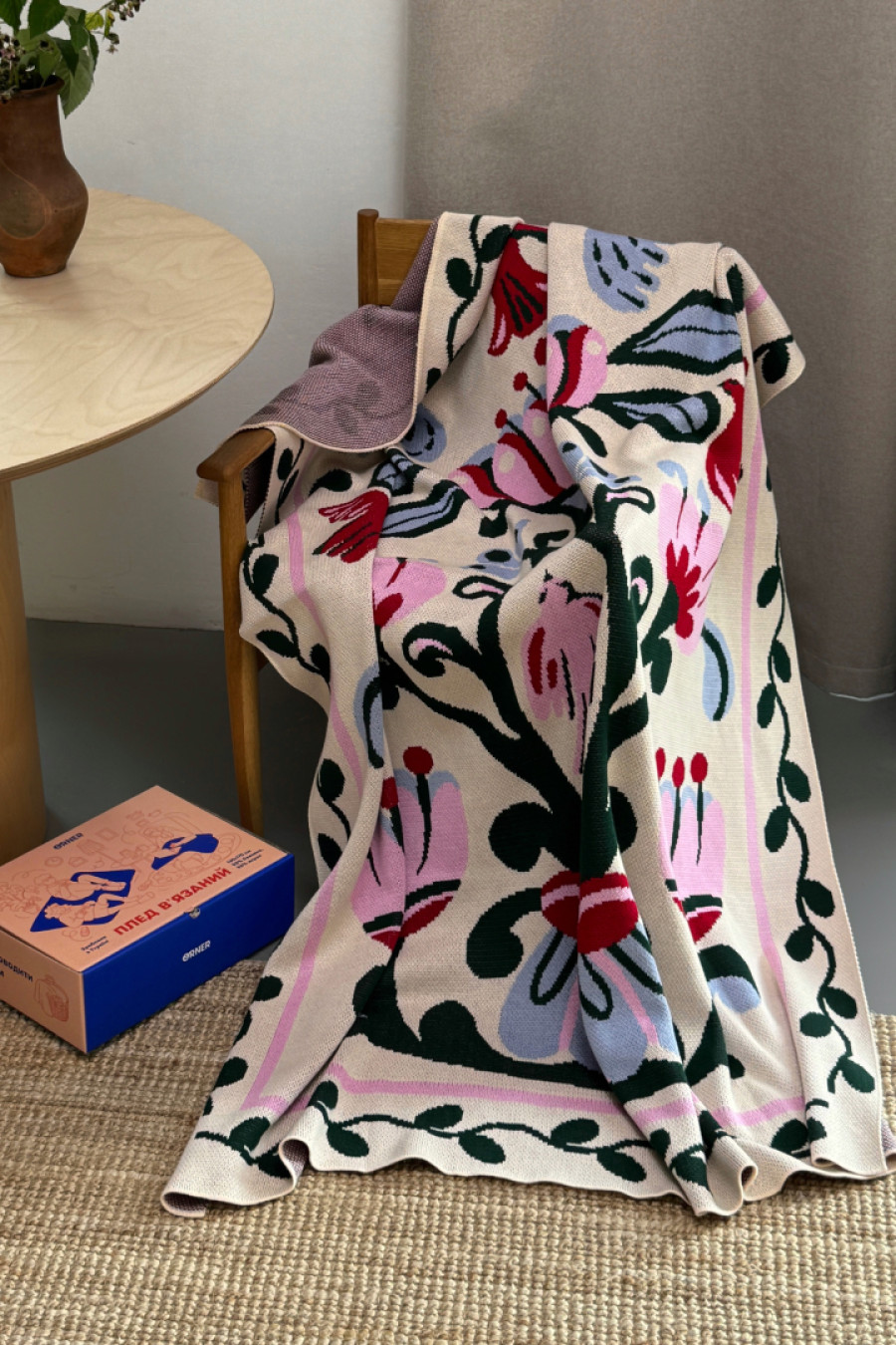 Очаровательный теплый вязаный плед из мягкой хлопково-акриловой пряжи кремово-молочного цвета с красочным узором: стилизованное "древо мироздания", олицетворяющее связь поколений, с птичками и растительным орнаментом-вязью. Изделие придаст интерьеру изысканность и этничность, подарит приятное ощущение "отчего дома" даже если вы за тысячу километров от родных пенатов. В него так удобно завернуться и хоть на мгновение забыть о невзгодах и ненастье за окном. Плед станет удачным подарком к праздникам или сувениром для любителей украинских традиций.