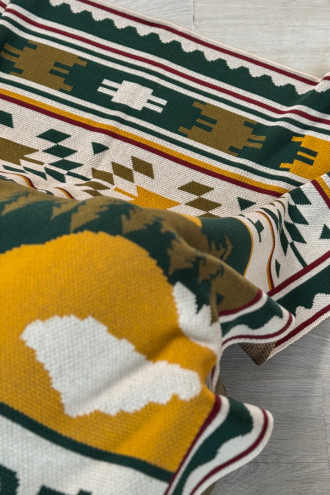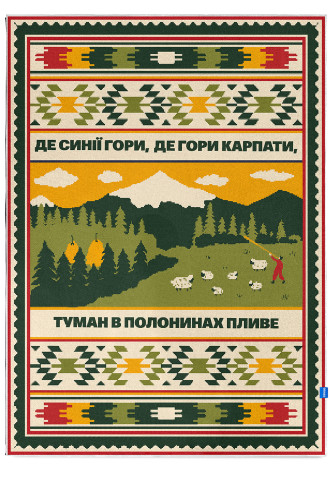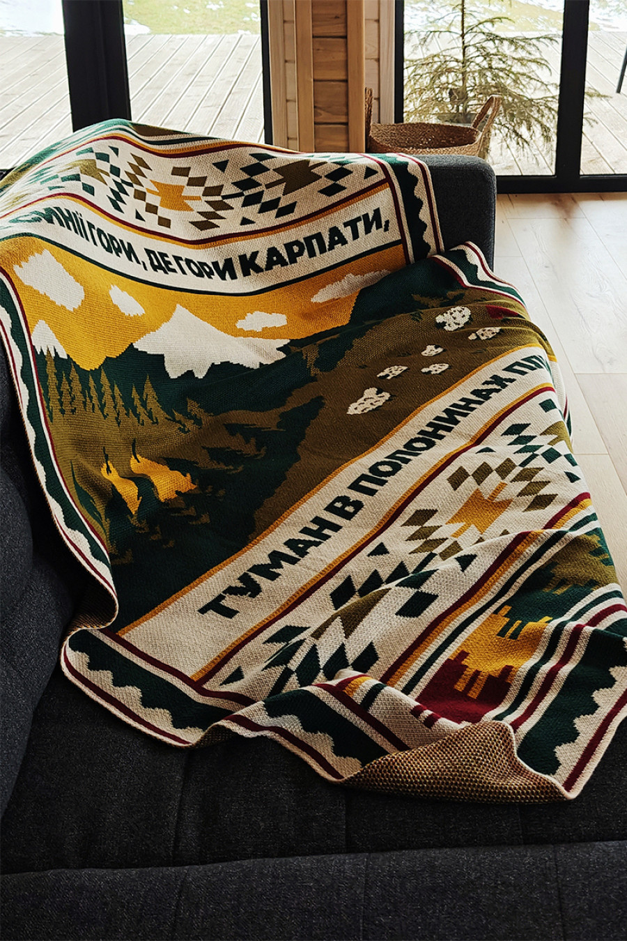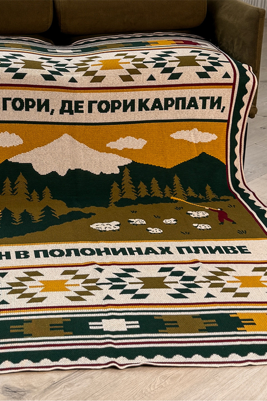 Светло-бежевый вязаный плед из мягкой смессовой пряжи с красочным узором-картиной: горы и долины, пастух с трембитой, геометрические орнаменты-мотивы и строчки из песни о "синих горах", который словно погружает в тайны Карпат. Изделие придаст вашему интерьеру изысканность и этничность, подарит приятное ощущение "отчего дома" даже если вы за тысячи километров от родных пенатов. В него так удобно завернуться и хоть на мгновение забыть о невзгодах и ненастье за окном. Плед станет удачным подарком к праздникам или сувениром для любителей украинских традиций.
