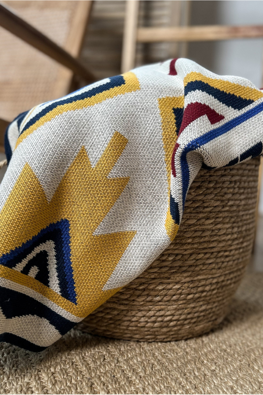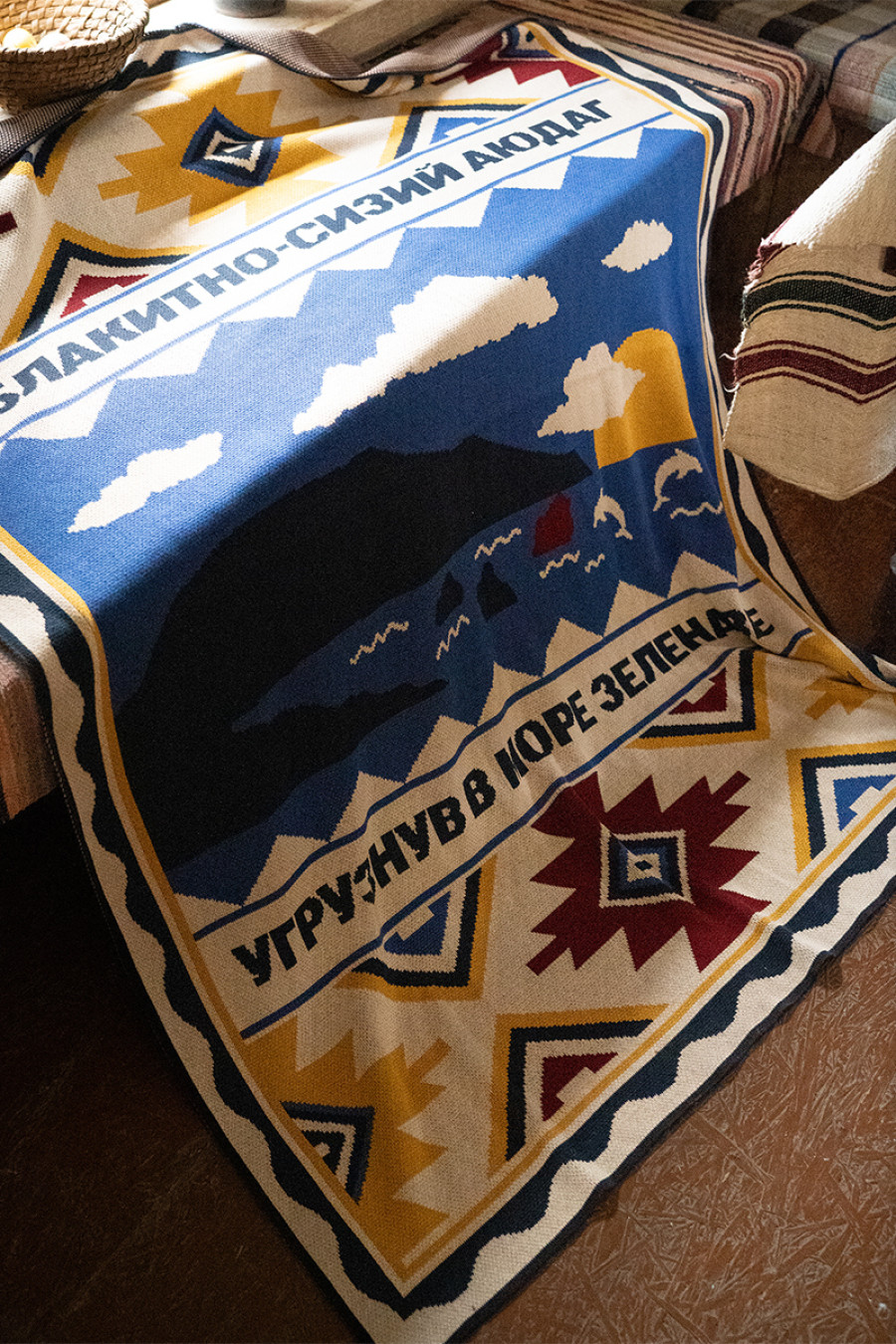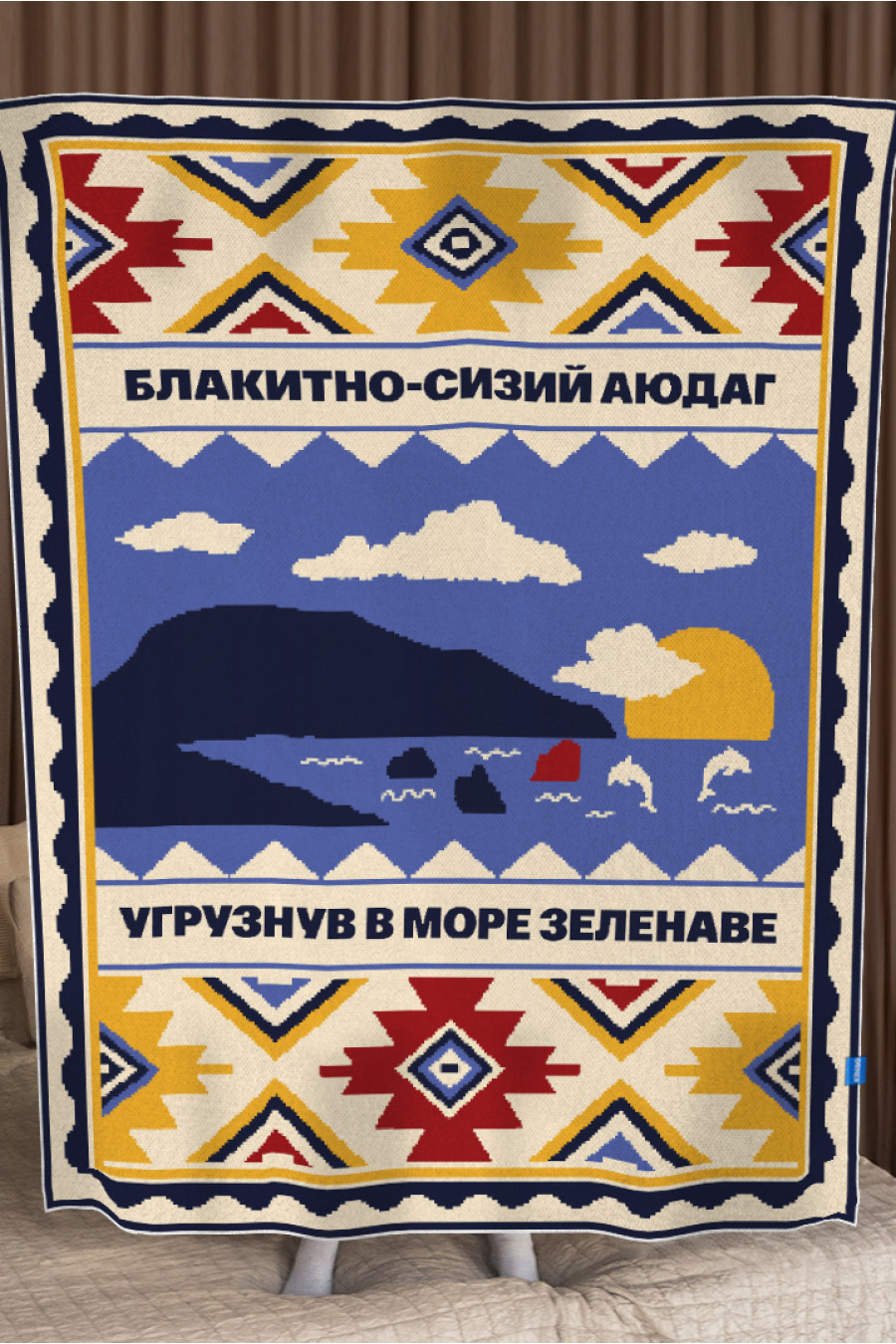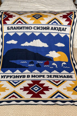 Вязаный теплый плед из мягкой смессовой пряжи светло-бежевого цвета с красочным узором-картиной: Черное море, дельфины, Аюдаг, геометрические орнаменты и строчки из поэзии Валерьяна Полищука, который перенесет в такой щемяще-родной Крым. Изделие придаст вашему интерьеру изысканность и этничность, подарит приятное ощущение "отчего дома" даже если вы за тысячи километров от родных пенатов. В него так удобно завернуться и хоть на мгновение забыть о невзгодах и ненастье за окном. Плед станет удачным подарком к праздникам или сувениром для любителей украинских традиций.