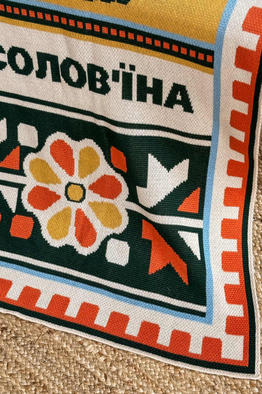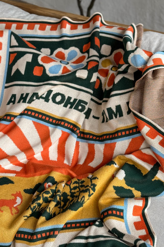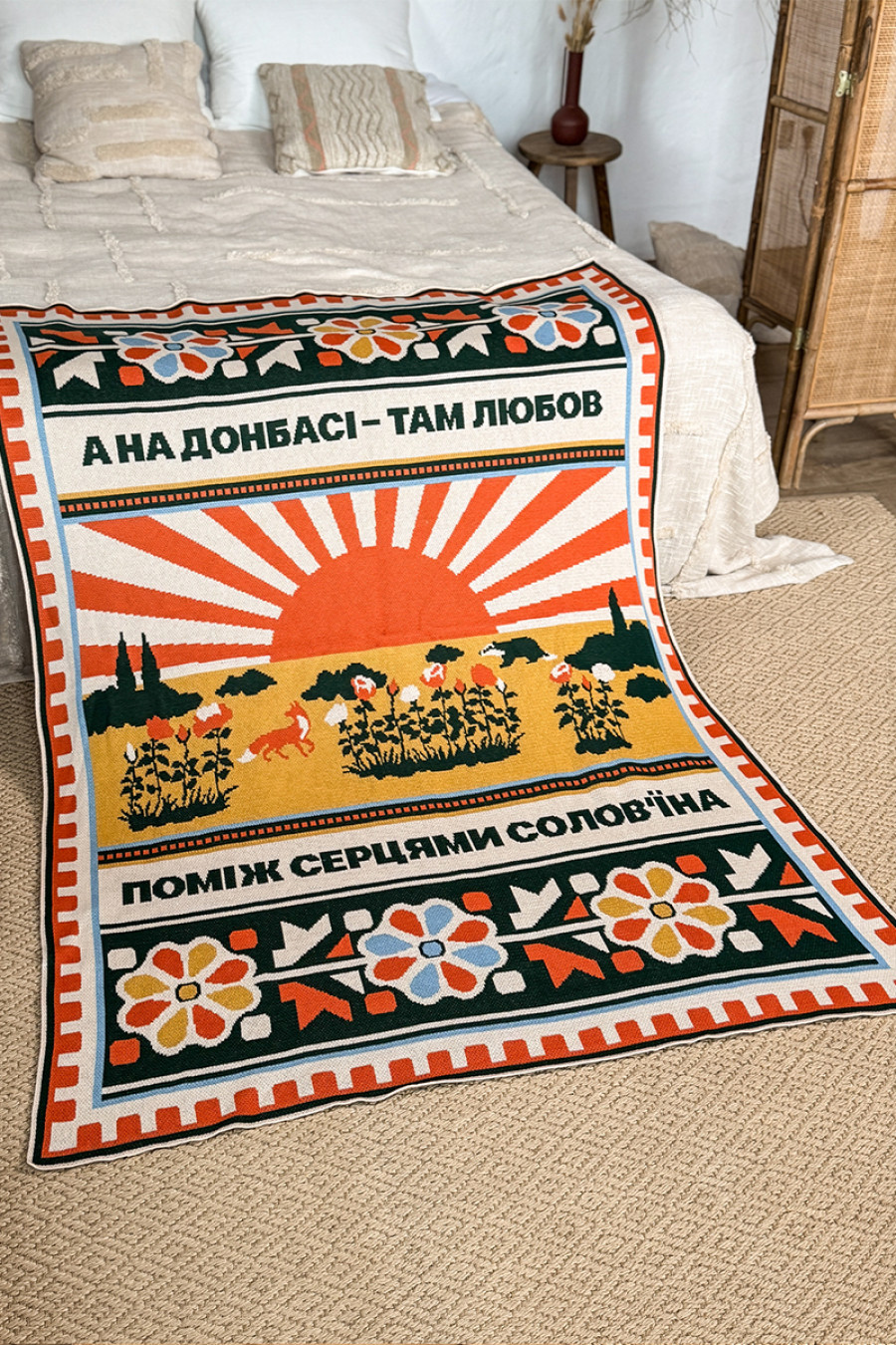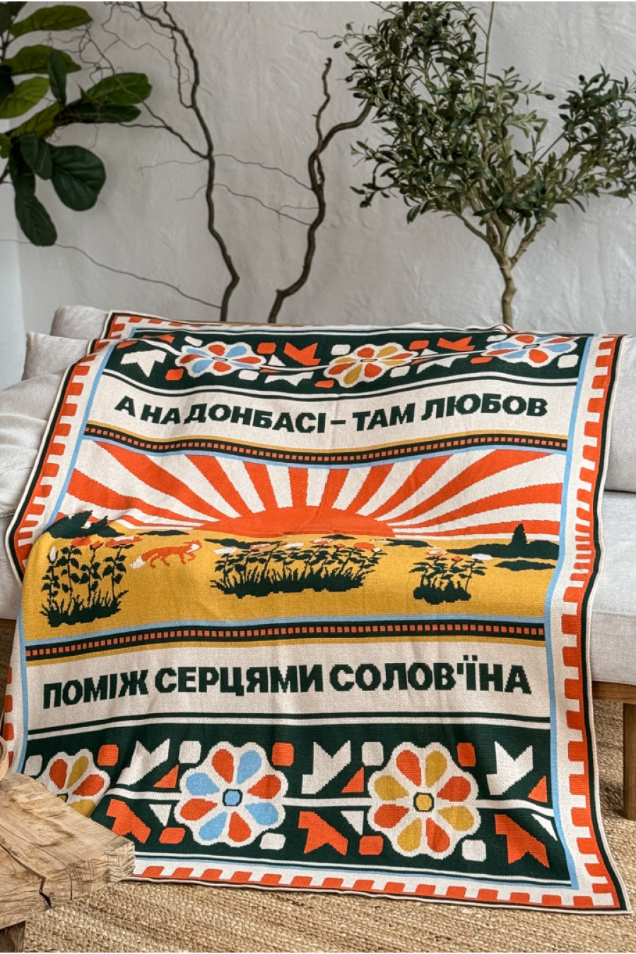 Уютный вязаный плед из мягкой смессовой пряжи светло-бежевого цвета с узором-картиной: панорама Донбасса, цветочные орнаменты на черном фоне и строчки из стихотворения Сосюры, от которого так и веет сухими ветрами и полынью. Изделие придаст вашему интерьеру изысканность и этничность, подарит приятное ощущение "отчего дома" даже если вы за тысячи километров от родных пенатов. В него так удобно завернуться и хоть на мгновение забыть о невзгодах и ненастье за окном. Плед станет удачным подарком к праздникам или сувениром для любителей украинских традиций.