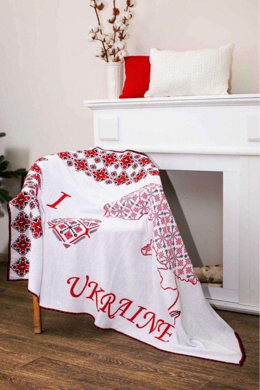 Бело-кремовый вязаный плед из мягкой акриловой пряжи с контрастным узором в стиле этно: карта Украины и геометрические орнаменты в красно-черной гамме. Плед украсит интерьер вашего дома, придаст ему особый уютный колорит. Изделие подарит ощущение тепла в холодную пору и придаст тихим семейным вечерам покой и гармонию. Он станет прекрасным подарком к любому празднику для ваших родных или друзей.