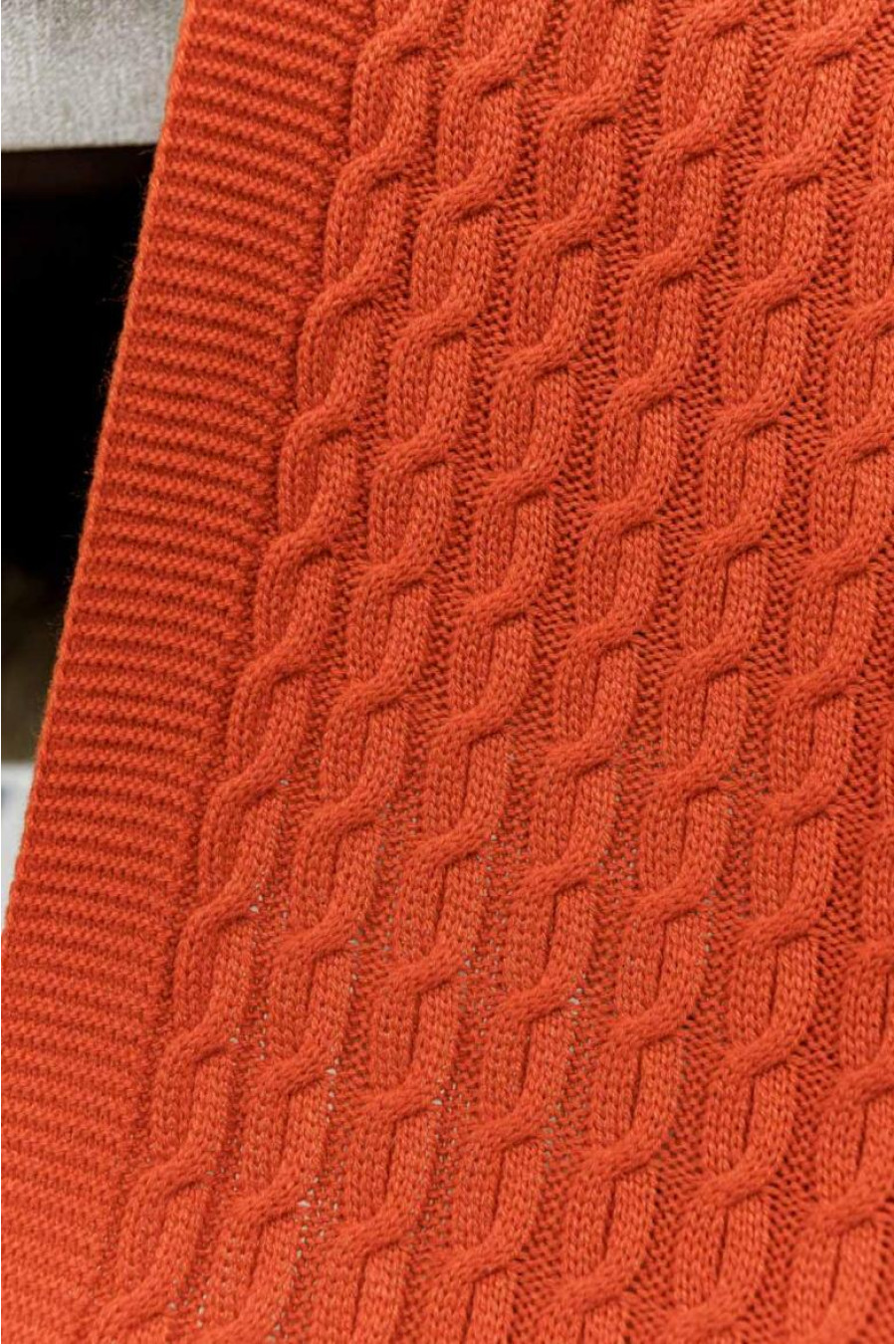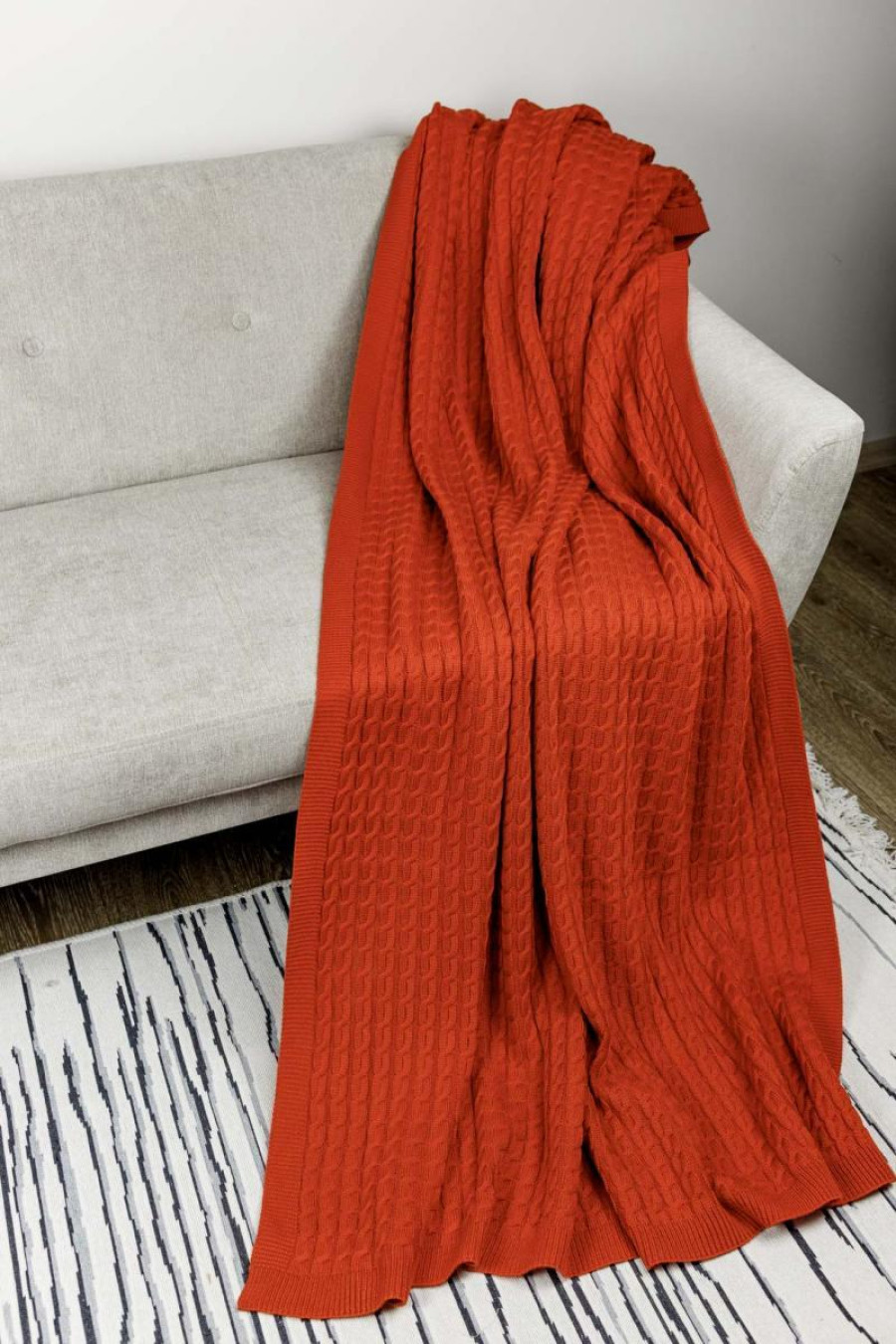 Вязаный теплый плед из приятной мягкой акриловой пряжи оранжево-терракотового цвета с объемным узором-переплетениями, который придаст домашнему интерьеру спокойную гармонию в осенних красках. Он подарит ощущение уютного тепла в холодную дождливую пору и позволит переключиться после тяжелого дня. Плед станет прекрасным подарком и для ценителей ленивого досуга за чашечкой кофе и интересной книгой, и для тех, кто любит плотно укутаться во что-то тепленькое.