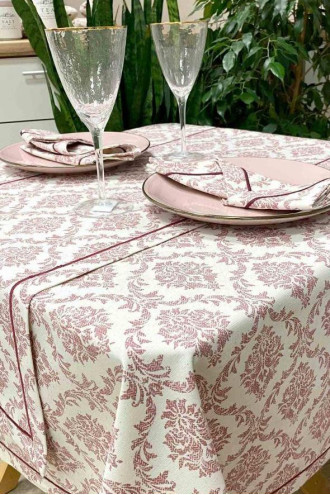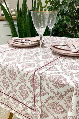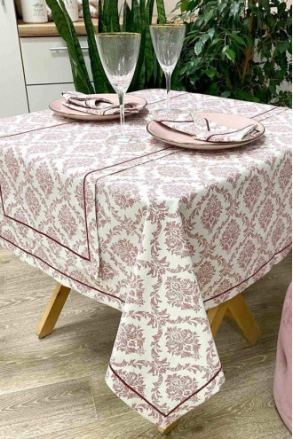 Праздничная скатерть на стол из смессового плотного текстиля молочного цвета с ажурным растительным орнаментом в бордово-винной гамме и вышитым кантом. Скатерть удачно дополнит интерьер как в классическом, так и в стиле лофт, придаст ему сдержанность и нарядность. Изделие может быть в нескольких размерных вариантах и подойдет и на маленький столик, и на большой обеденный стол для всей семьи. Она будет удачным подарком к празднику для ваших друзей и близких.