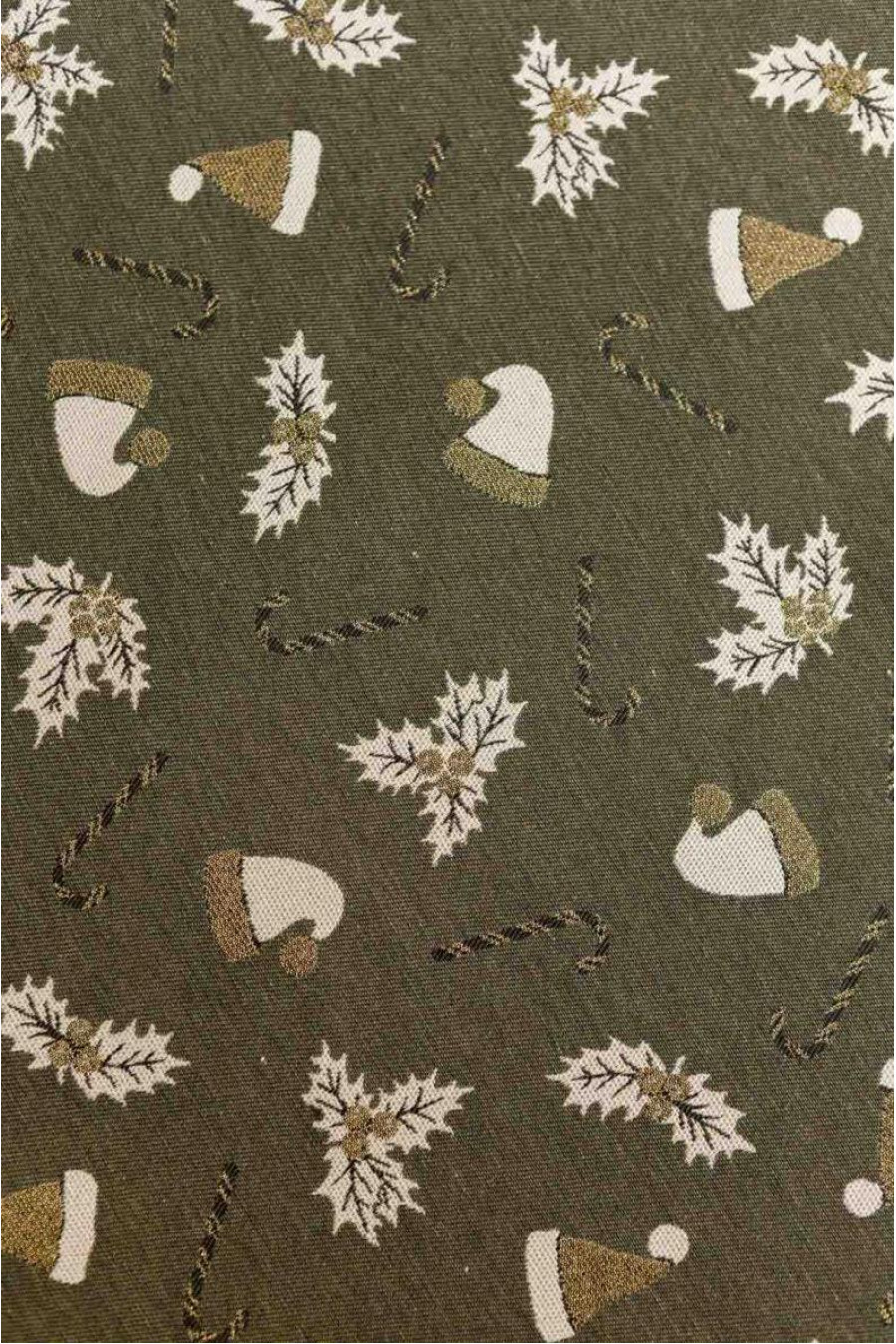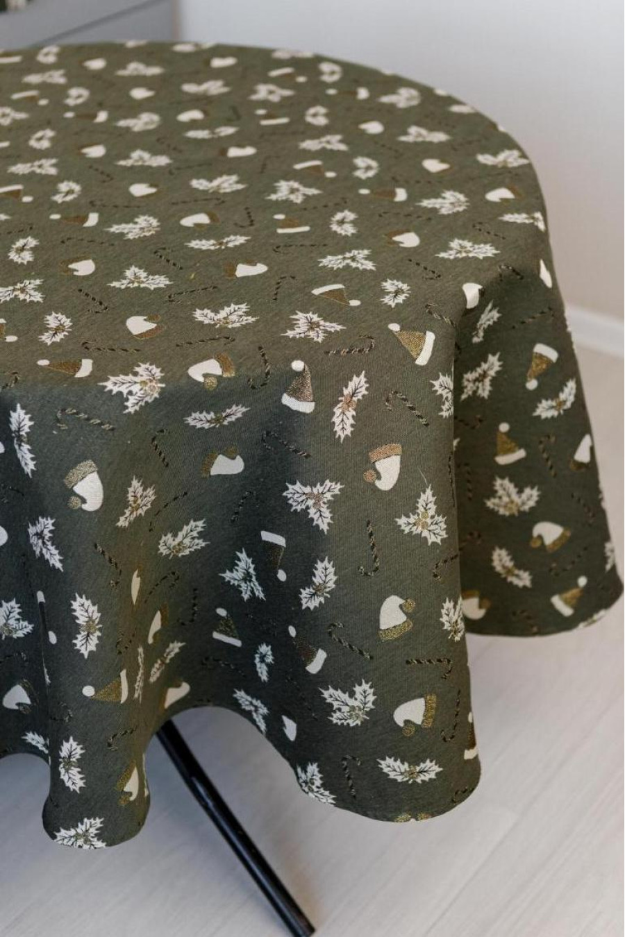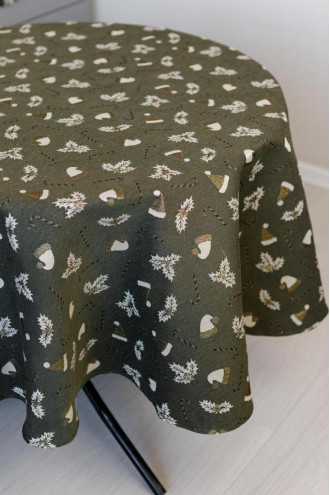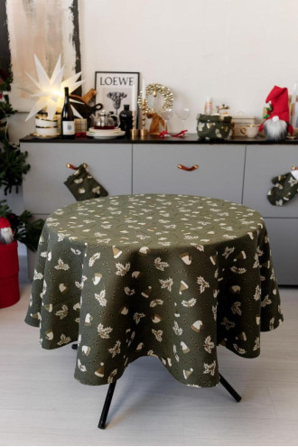 Круглая новогодняя скатерть на стол из смессовой хлопковой ткани с люрексом темно-зеленого цвета с золотисто-белым рисунком: новогодние шапочки, полосатые леденцы-палочки и плоды остролиста. Изделие придаст вашему интерьеру уют и особую снежную магию праздника. Скатерть идет в нескольких вариациях и подойдет на стол любого размера: от небольшого журнального столика до обеденного стола для большой семьи. Она станет прекрасным дополнением новогоднего праздничного стола и удачным вариантом подарка к праздникам.