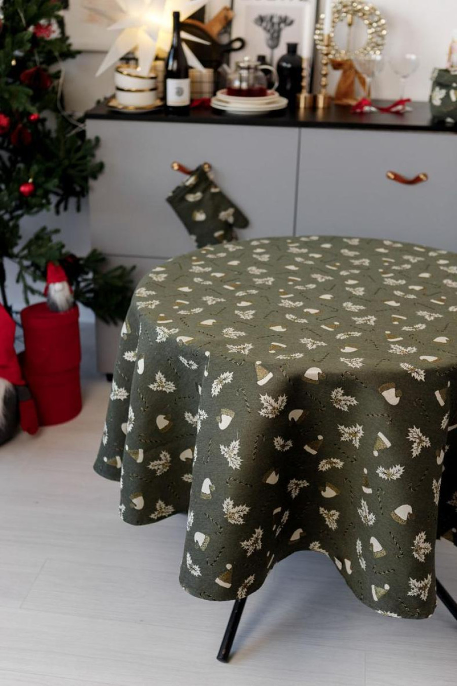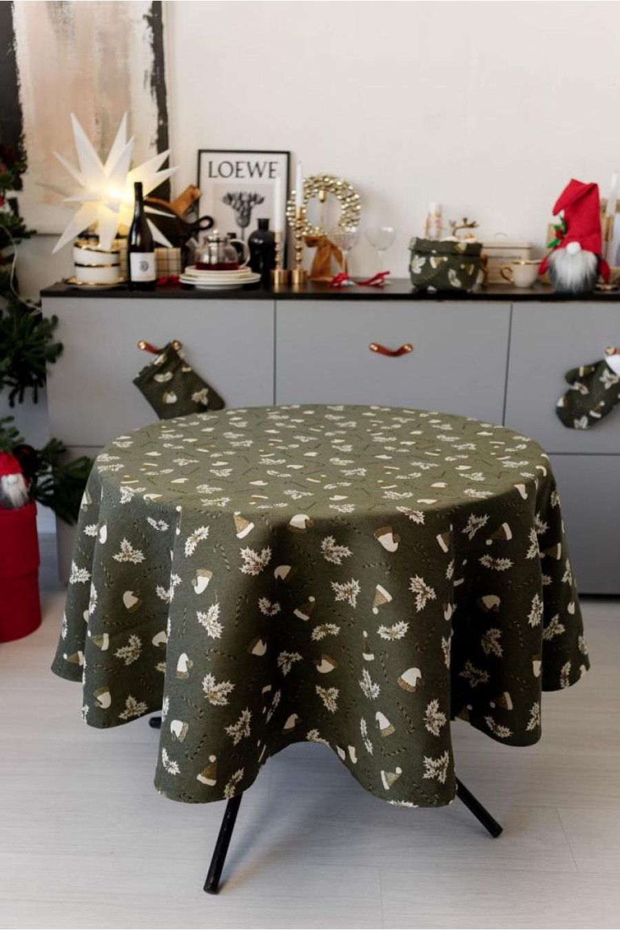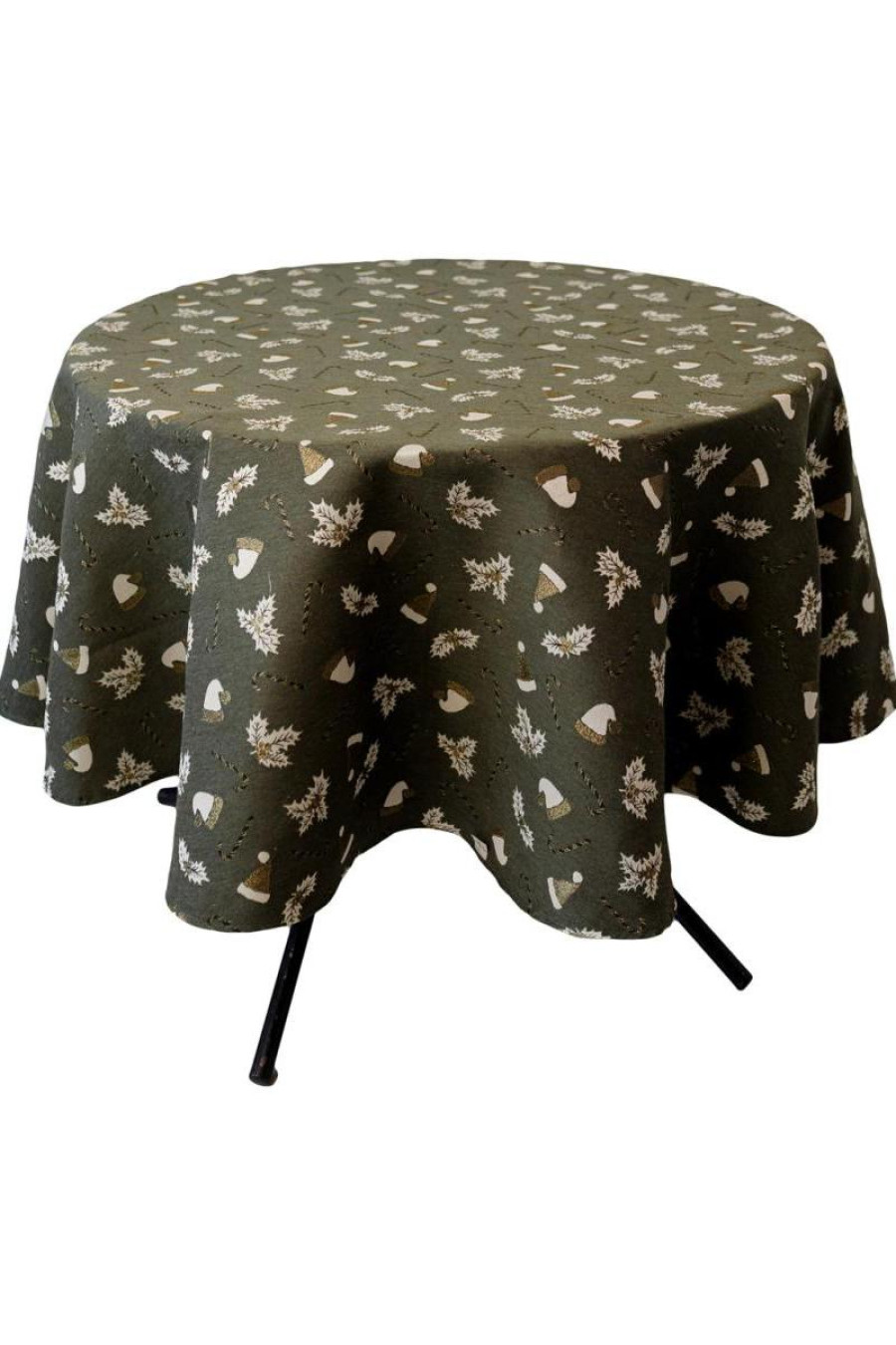Круглая новогодняя скатерть на стол из смессовой хлопковой ткани с люрексом темно-зеленого цвета с золотисто-белым рисунком: новогодние шапочки, полосатые леденцы-палочки и плоды остролиста. Изделие придаст вашему интерьеру уют и особую снежную магию праздника. Скатерть идет в нескольких вариациях и подойдет на стол любого размера: от небольшого журнального столика до обеденного стола для большой семьи. Она станет прекрасным дополнением новогоднего праздничного стола и удачным вариантом подарка к праздникам.