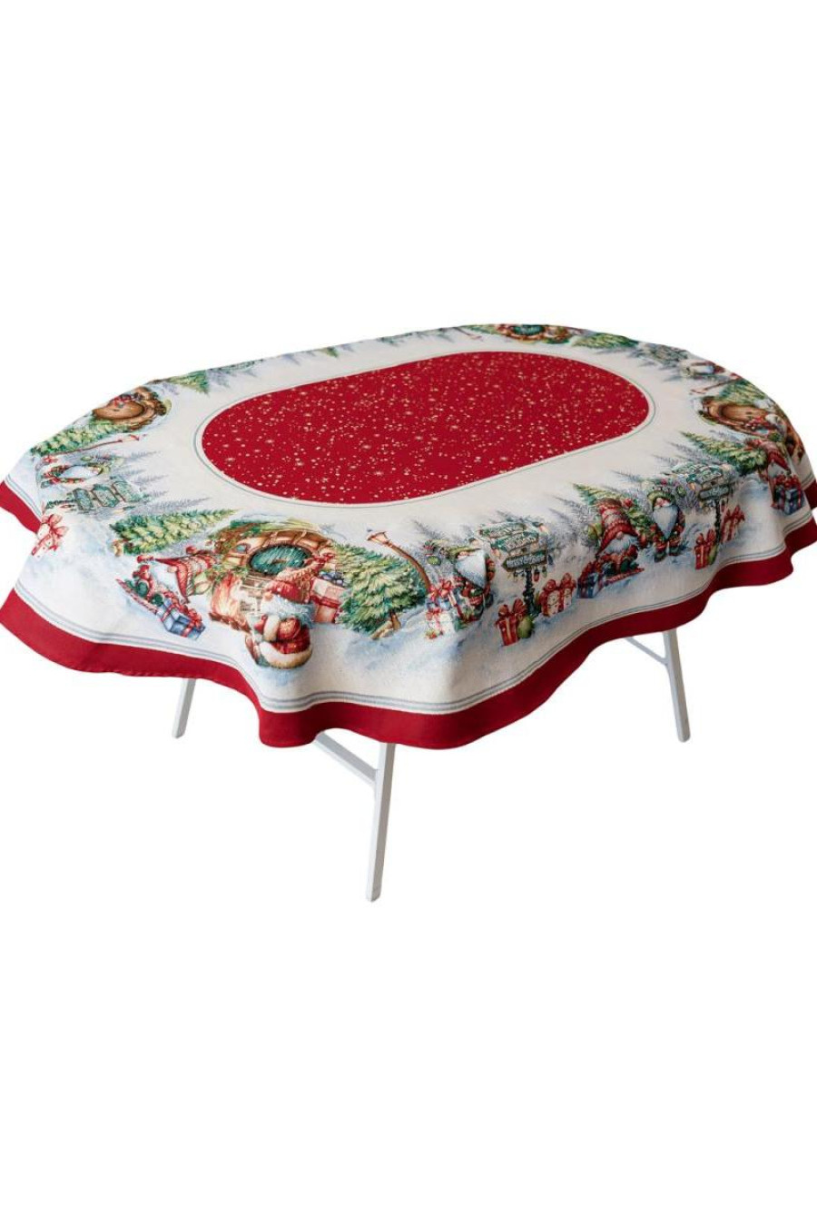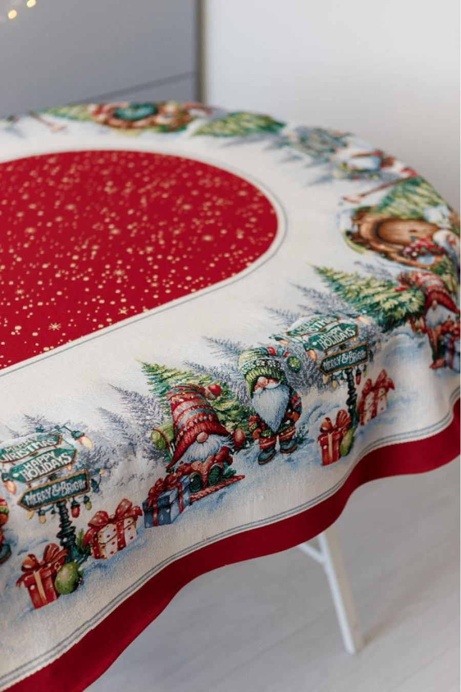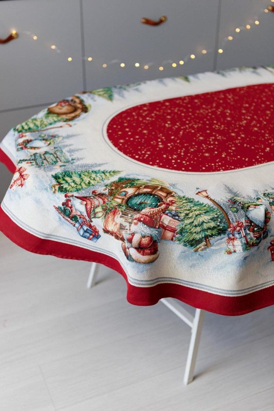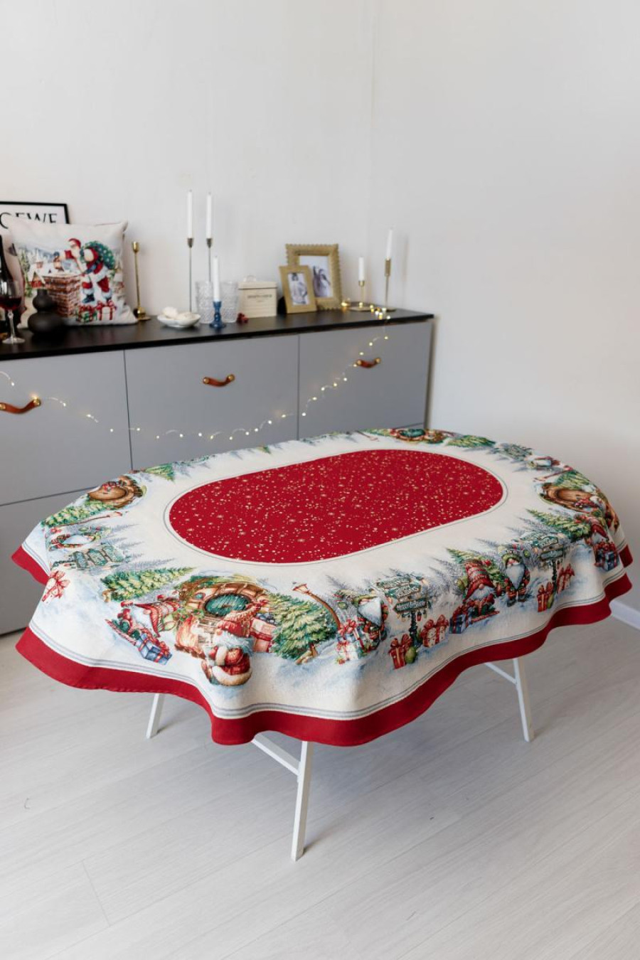 Комбинированная новогодняя овальная скатерть на стол из гобеленовой ткани красного цвета со звездами и белого цвета с рисунком-картиной: гномы у костра, елки с подарками, заснеженный лес. Изделие украсит праздничный стол, придаст интерьеру особую сказочную атмосферу и предвкушение новогодних чудес. Скатерть идет в нескольких размерах и подойдет на стол любого размера. Она станет прекрасным подарком к праздникам для любой хозяйки.