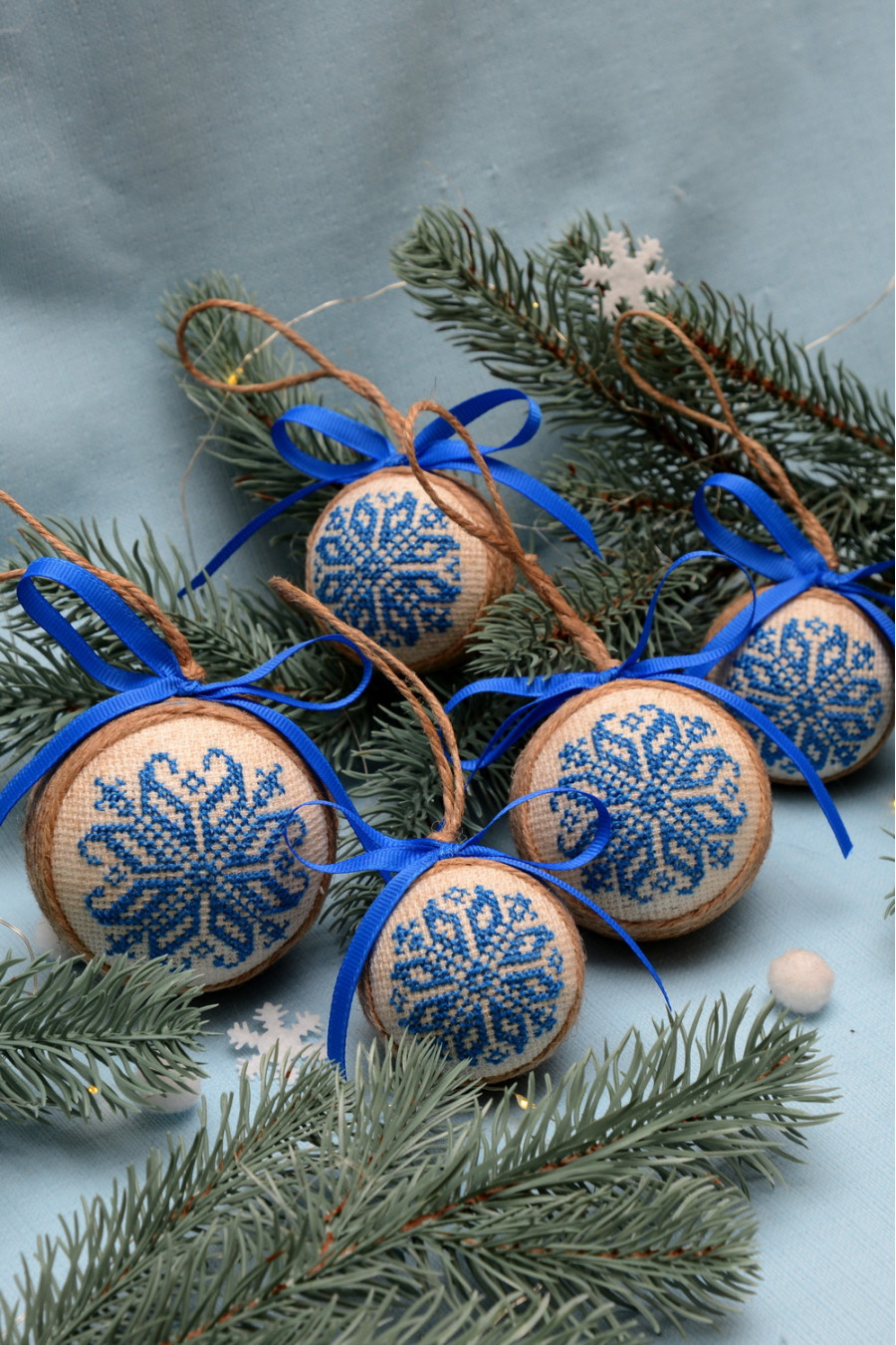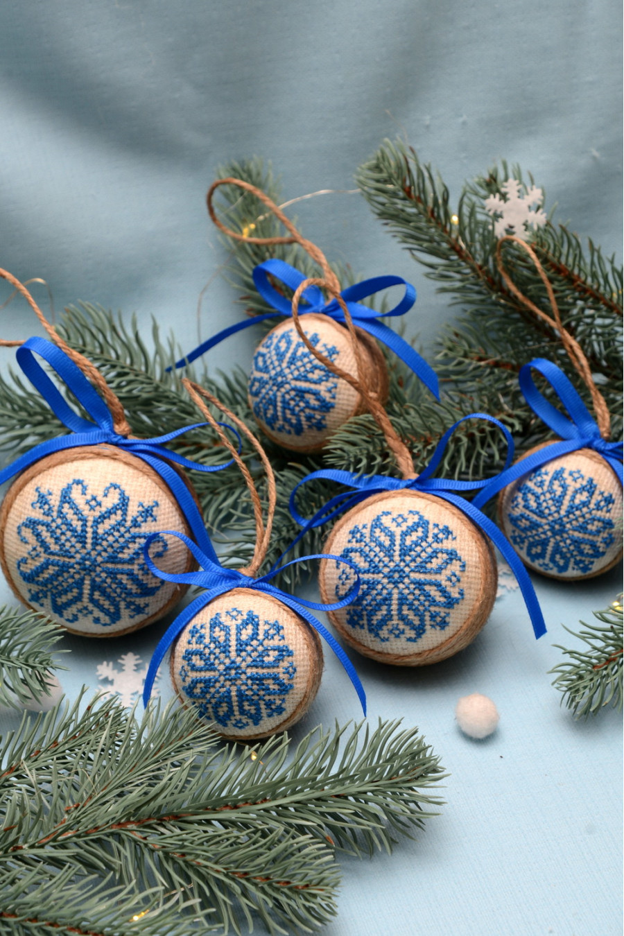 Набор елочных украшений-шариков в рустикальном стиле с вышитыми крестиком морозными цветами-снежинками синего цвета. Изделие имеет небьющуюся пенопластовую основу, окутанную джутовым шпагатом и декорированную вставкой из канвы с декором-орнаментом. Набор станет украшением вашей елки, придаст интерьеру сказочность и ощущение особой зимней магии, которая возвращает в детство и дарит искреннюю веру в чудеса. Комплект состоит из 5 шариков: один диаметром 7 см, один - 6 см и три шарика по 5 см. Изделие идет в подарочной упаковке-коробке.