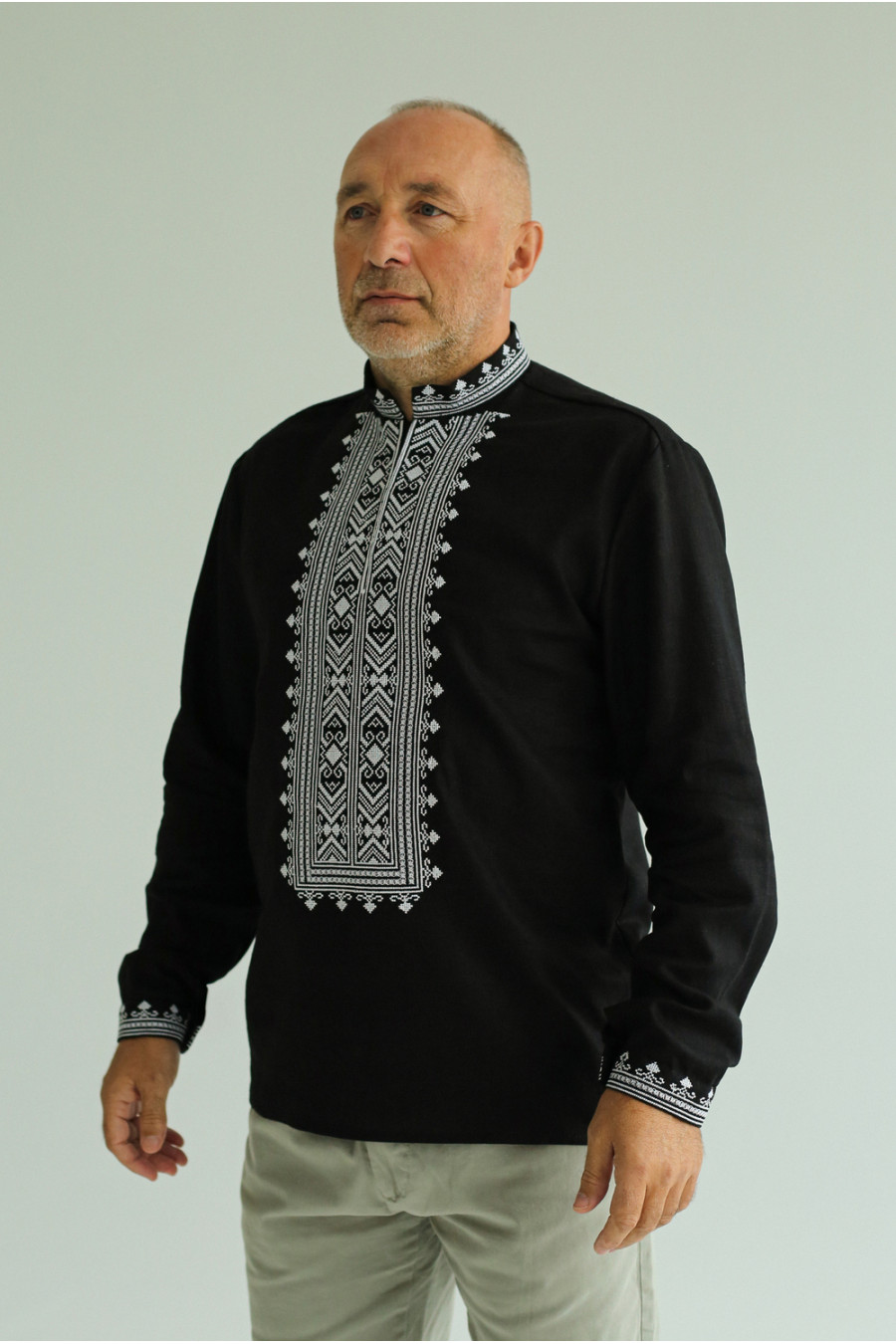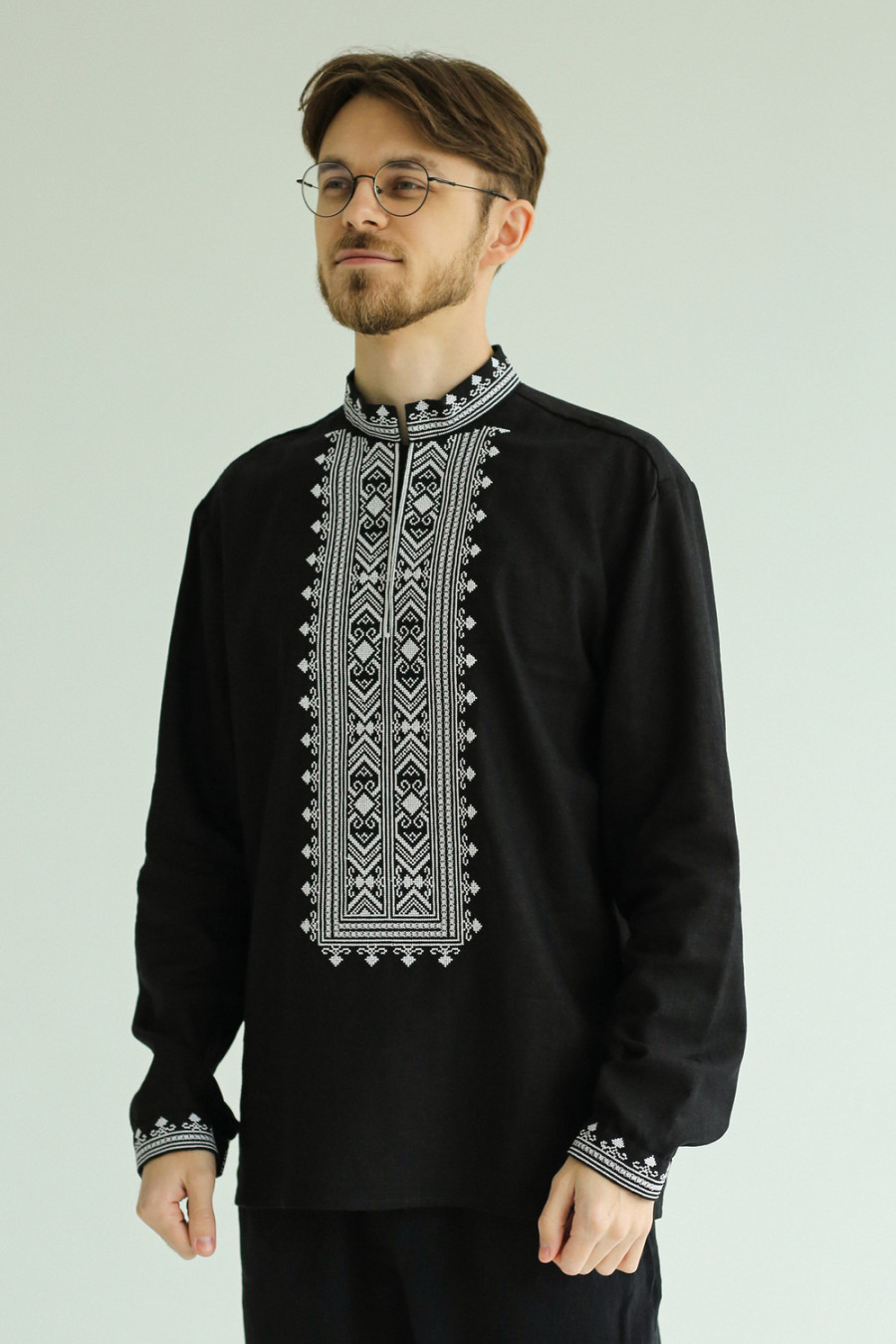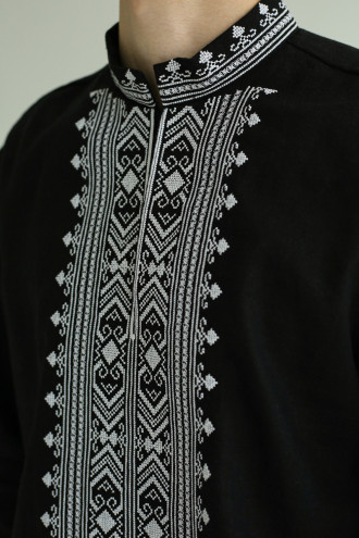 Стильная мужская вышиванка из смессовой льняной ткани черного цвета с контрастным вышитым декором, которая дополнит торжественный гардероб. Модель свободного покроя с воротником-стойкой, вырезом с потайной застежкой на полочке, приспущенной линией плеча, отрезной кокеткой на спинке, длинными просторными рукавами с манжетами на застежке. Манишку, воротник и манжеты украшает белый геометрический орнамент крестиком и мережка. Вышиванка украсит торжественный образ любого мужчины, придаст ему сдержанность. Наряд станет удачным вариантом и для деловой встречи, и для праздничного мероприятия.