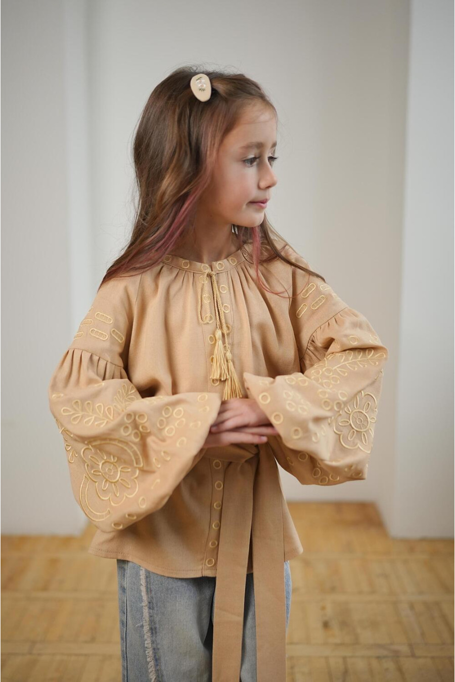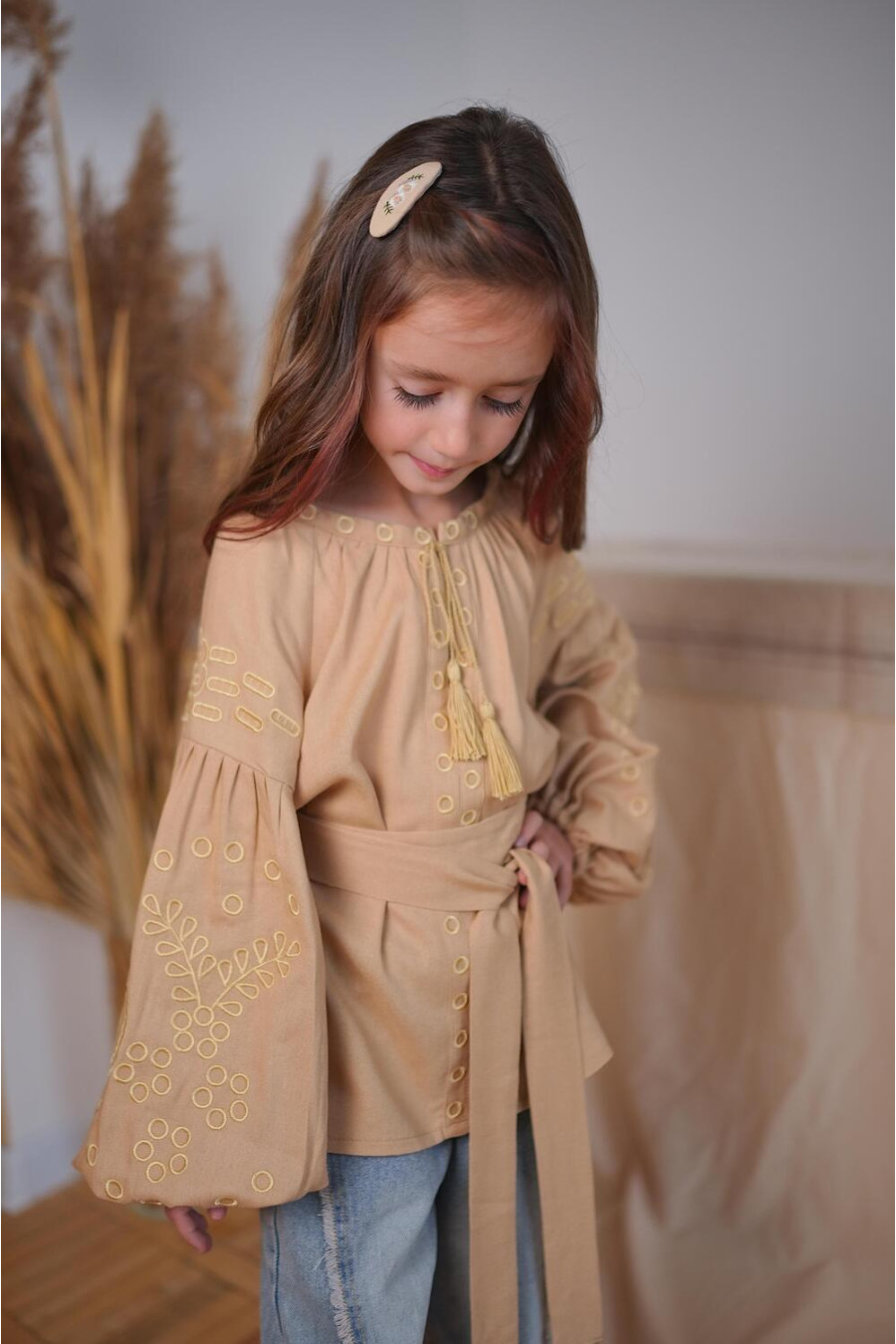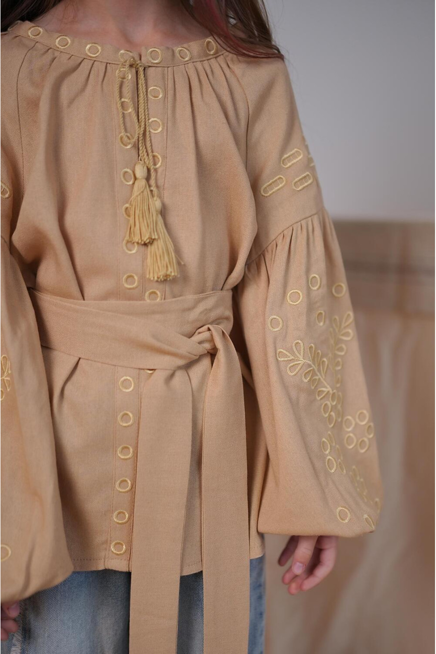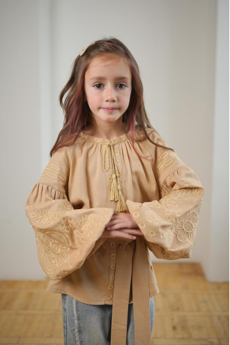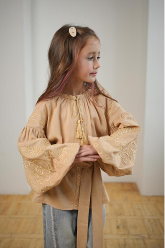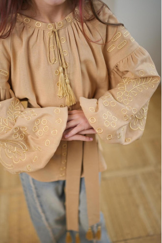 Изысканная кофейно-бежевая вышиванка для девочки из натурального смессового льна с пастельным вышитым орнаментом-декором. Модель свободного фасона с округлой горловиной со сборками, вырезом с завязками-кисточками, длинными пышными рукавами-реглан с манжетами, съемным поясом из основной ткани. Полочка и рукава украшены золотисто-бежевым растительным орнаментом гладью. Вышиванка украсит гардероб маленькой леди, придаст образу нежность и торжественность. Наряд будет уместен для любого мероприятия и удачно сочетается и с классическими брюками, и с джинсами.