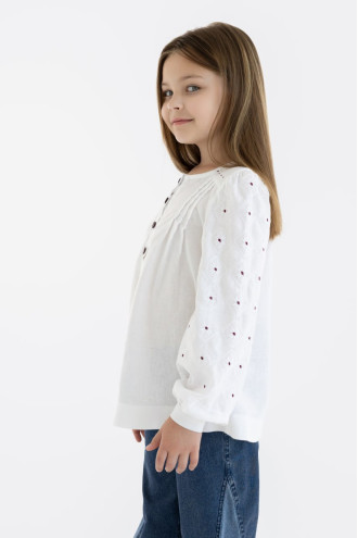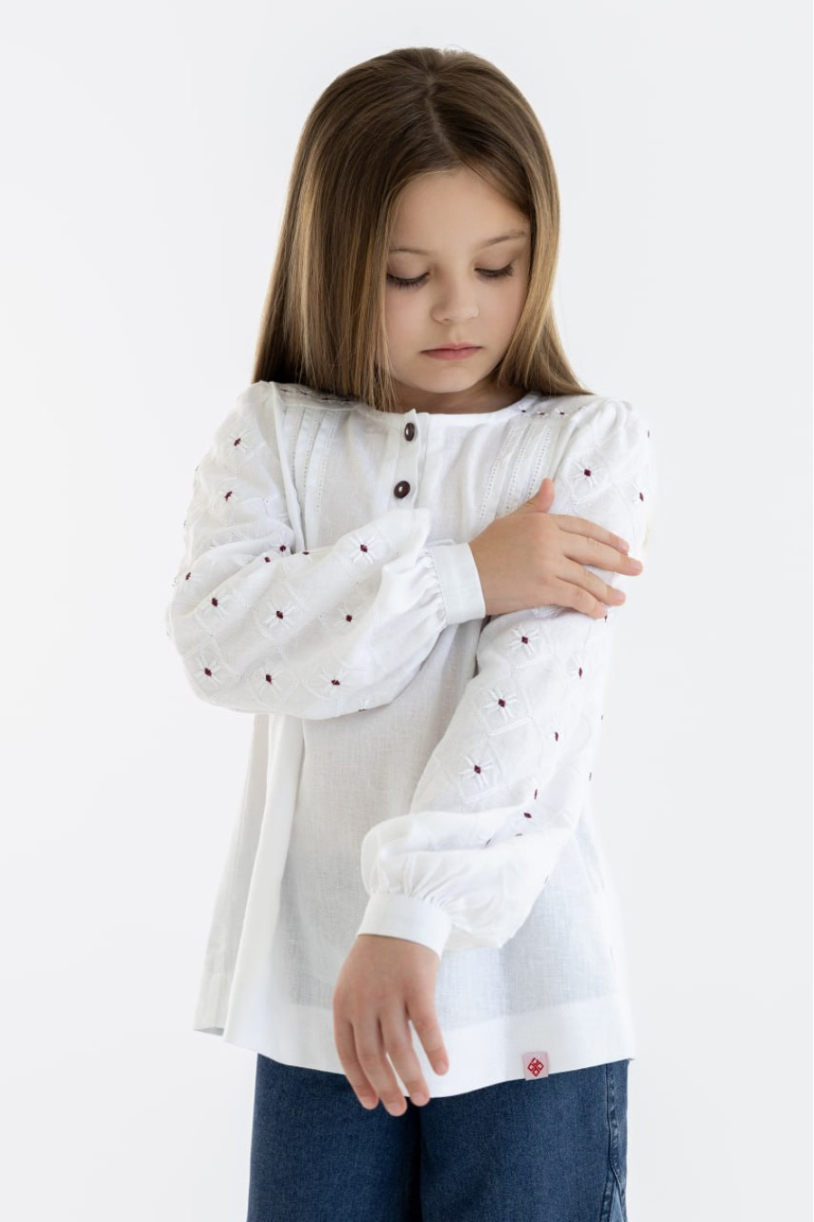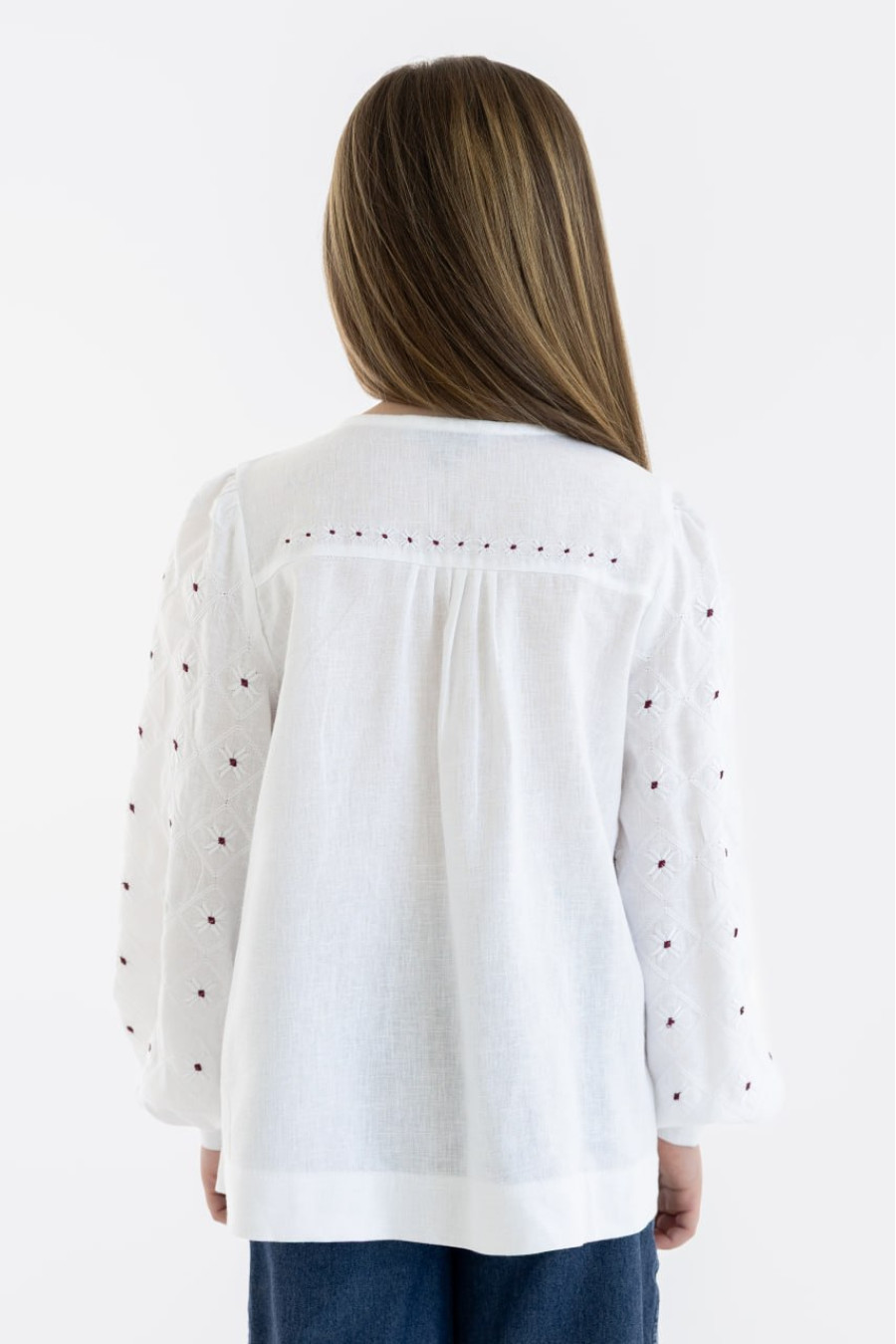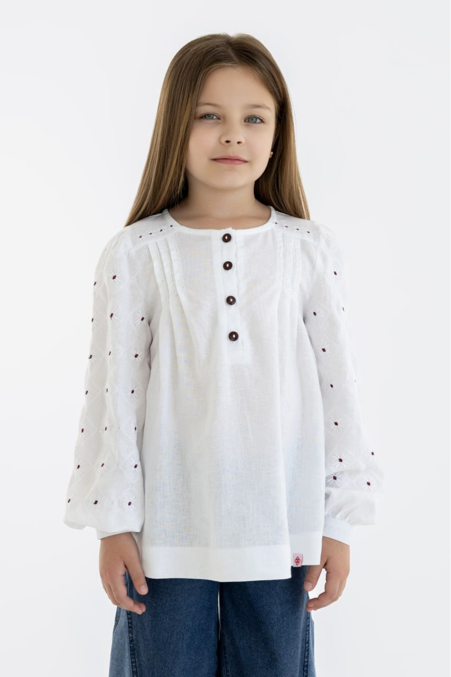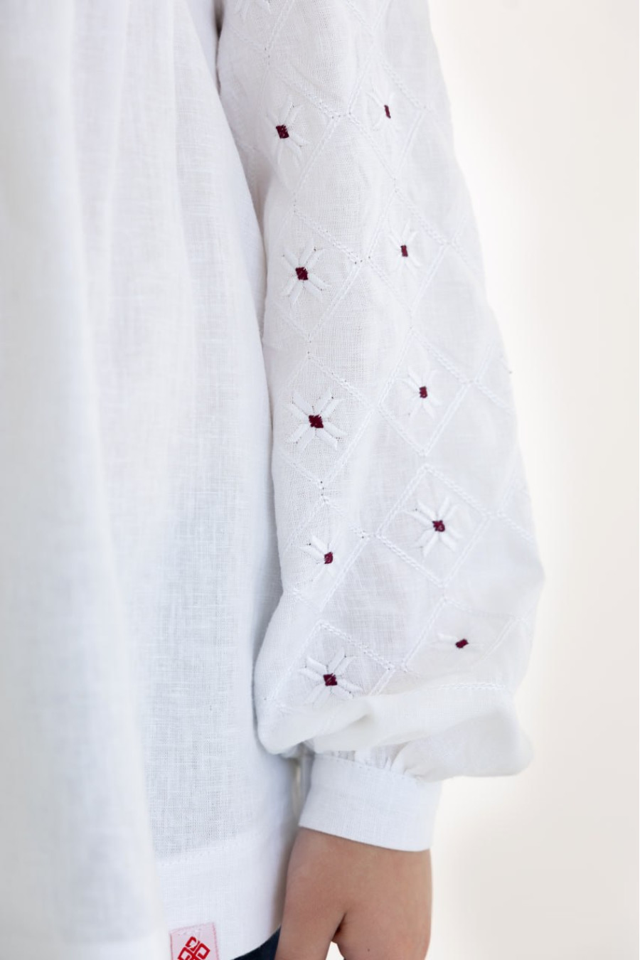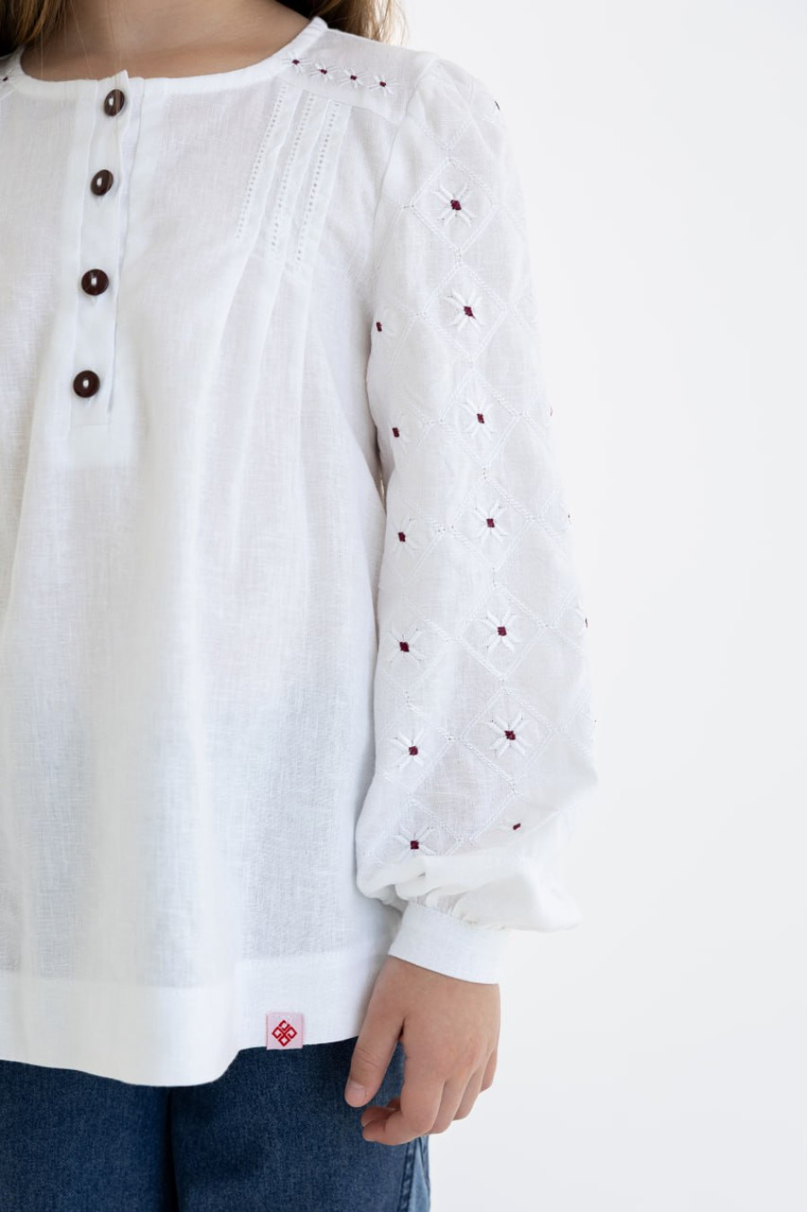 Белоснежная льняная современная вышиванка для девочки из смессовой натуральной ткани с вышитым орнаментом-декором. Модель свободного силуэта с округлой горловиной, отрезной кокеткой со сборками на спинке, длинными просторными рукавами с манжетами на застежке, швами-сборками у плечей, планкой с застежками-пуговицами на полочке. Рукава, плечи и кокетка наряда декорированы вышитым гладью бело-кремовым геометрическим орнаментом с цветами-звездочками с бордовыми сердцевинками. Вышиванка придаст образу свежесть и воздушность, подчеркнет его нежность и загадочность. Наряд будет уместен для любого события и сочетается как с классическим, так и с кэжуал низом.