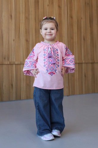 Изысканная вышиванка для девочки из смессовой льняной ткани зефирно-розового цвета с контрастным вышитым декором. Модель свободного фасона с широкой округлой горловиной со сборками, вырезом с завязками-кисточками на полочке, длинными пышными рукавами-реглан с высокими манжетами на застежке. Ворот, полочка и рукава декорированы голубо-малиновым геометрическим орнаментом гладью. Вышиванка придаст маленькой леди очарование и игривость, подчеркнет нежность образа. Наряд можно сочетать как со сдержанным классическим низом, так и с джинсами или моделями фолк.