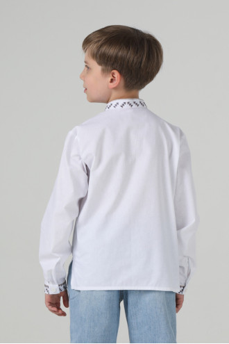 Вышиванка для мальчика из натуральной хлопковой ткани белоснежного цвета с контрастным вышитым декором, которая придаст образу свежесть. Модель свободного фасона с воротничком-стойкой, приспущенной линией плеча, длинными просторными рукавами с манжетами на застежке, планкой с застежками-пуговицами на полочке, шлицами в боковых швах. Манишку украшает вышитый крестиком сине-графитовый стилизованный орнамент-гроздья, воротник и манжеты – орнамент-вязь. Вышиванка подчеркнет стильность и сдержанность образа, придаст ему оригинальность. Наряд будет удачным вариантом для любого торжественного события.