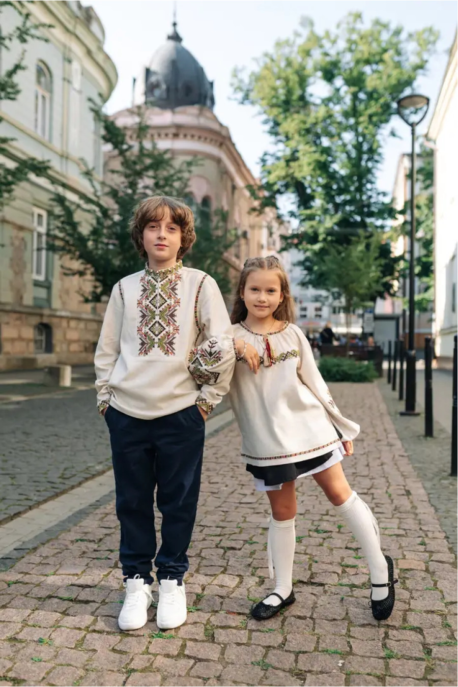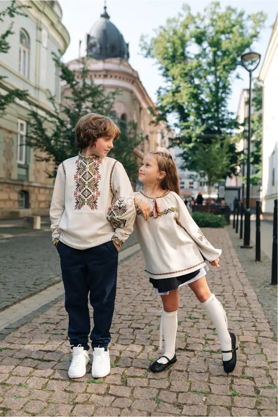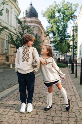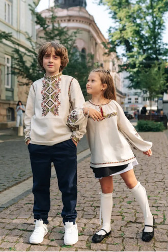 Комплект вышиванок в современном стиле для мальчика и девочки «Батьківський дар» из смессового льна светло-бежевого цвета с красочным вышитым орнаментом-декором.