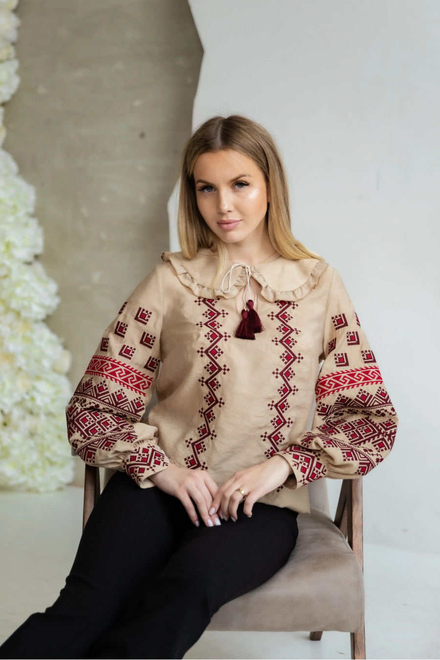 Вышиванка «Нарядная» совмещает традиционные мотивы с современным кроем. Выполнена из легкого льна, что делает ее комфортной и приятной в носке. Модель имеет свободный силуэт и округлую горловину с небольшим разрезом и уголками на завязках. По краю воротника проходит ажурная обработка, придающая изделию легкость и деликатность. Рукава объемные и слегка прибранные. Они украшены широкими орнаментальными полосами с геометрическим узором. Вышиванка выглядит выразительно и одновременно универсально, поэтому ее легко комбинировать как с классическими брюками или джинсами, так и с юбками.