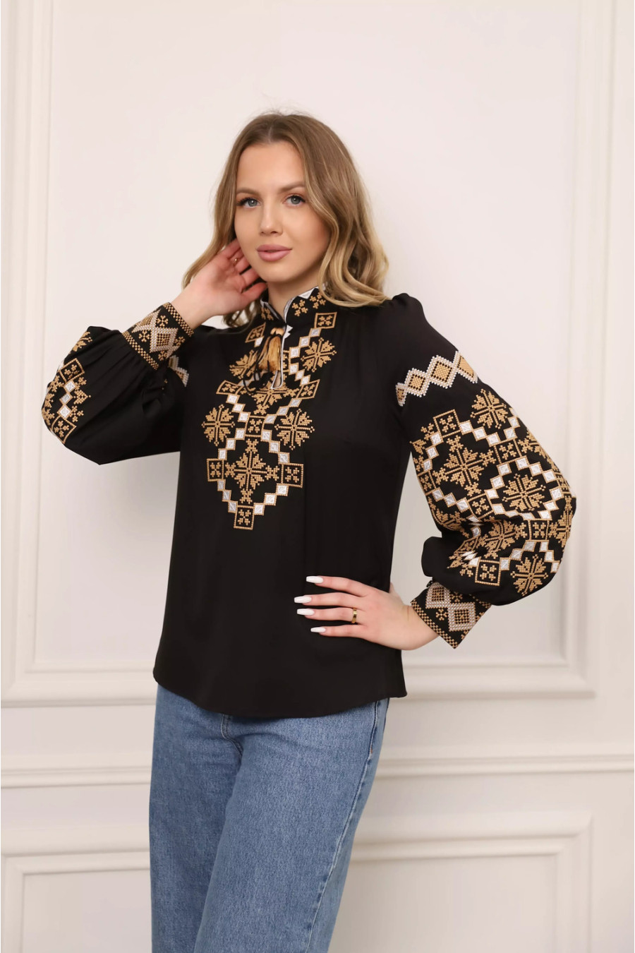 Элегантная современная вышиванка из приятной на ощупь рубашечной ткани черного цвета с контрастным вышитым орнаментом-декором в золотисто-белой гамме. Модель свободного силуэта с невысоким воротничком-стойкой, глубоким вырезом с завязками-кисточками, выточками на груди, длинными пышными рукавами с высокими манжетами на застежках. Полочка и рукава наряда украшены геометрическим орнаментом крестиком. Вышиванка дополнит девичий гардероб, придаст образу изысканность и шарм. Наряд можно сочетать как с офисным низом, так и с джинсами или юбками в стиле этно. При желании можно создать образ для пары или семейный в сочетании с другими вышиванками из этой серии.