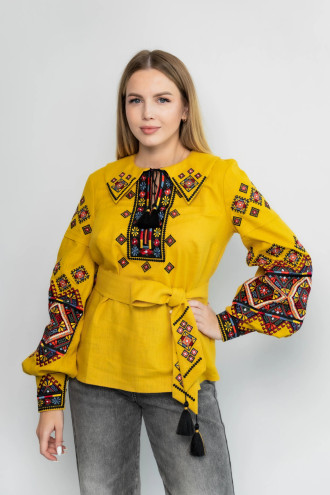 Горчично-охряная женская вышиванка из смессовой натуральной ткани с ярким многоцветным вышитым декором, которая придаст образу сочных красок. Модель А-образного фасона с отложным фигурным воротничком, вырезом с завязками-кисточками, длинными просторными рукавами с высокими манжетами на застежке, выточками на груди, съемным поясом из основной ткани. Воротник, полочку, рукава и пояс украшает геометрический и цветочный орнамент гладью. Вышиванка подчеркнет красоту и женственность форм, придаст образу изысканность и загадочность. Наряд дополнит праздничный гардероб и сочетается и со строгой классикой, и с кэжуал или фолк моделями.