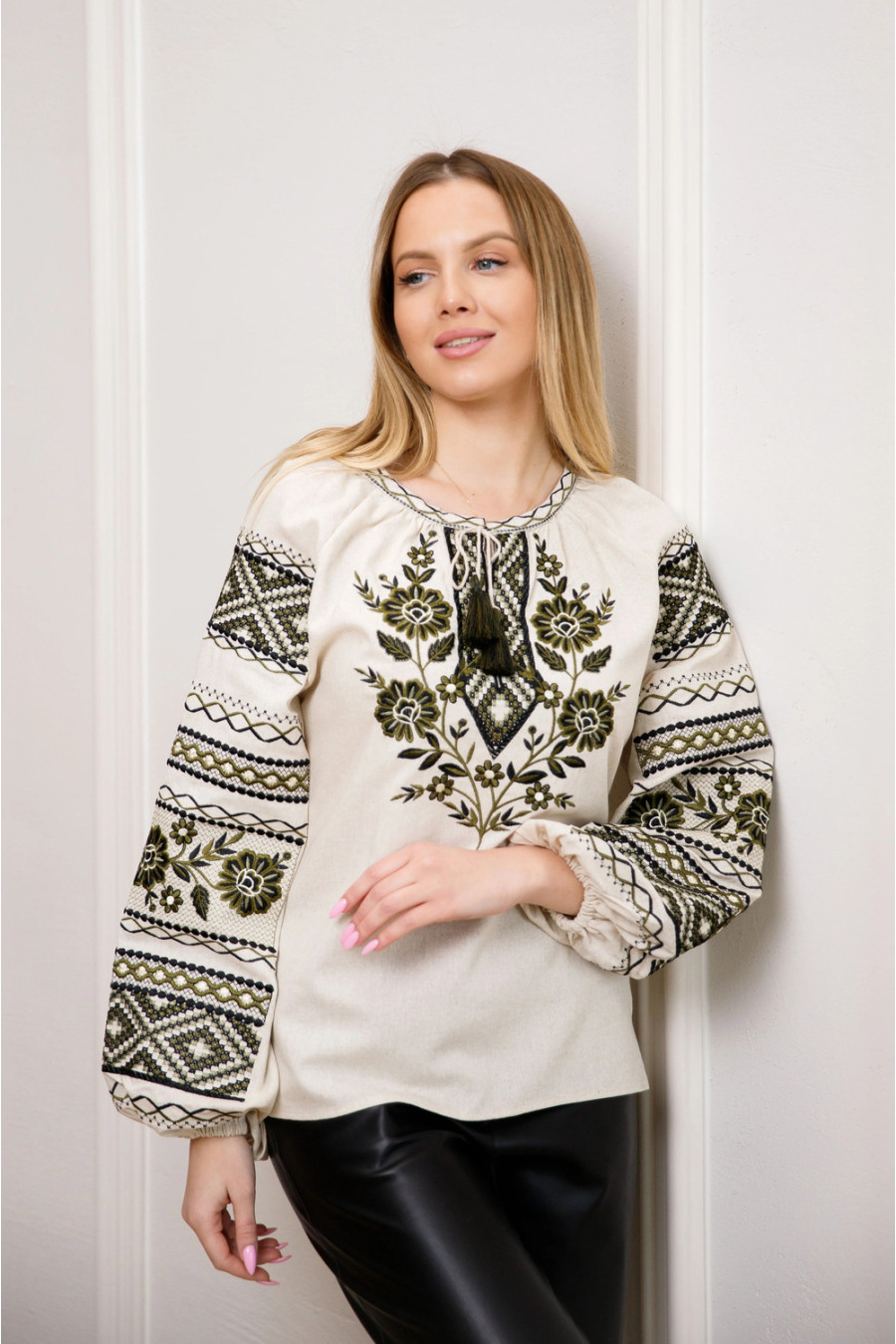 Очаровательная традиционная женская вышиванка из приятного на ощупь смессового льна меланжево-бежевого цвета с темным вышитым декором. Модель свободного покроя с округлой горловиной со сборками, вырезом с завязками-кисточками, длинными просторными рукавами-реглан с манжетами на резинке, шлицами в боковых швах. Полочка и рукава украшены растительным и геометрическим орнаментом гладью в оливково-зелено-черной гамме. Вышиванка придаст образу элегантность и нежность, подчеркнет хрупкость форм. Наряд можно дополнить как деловыми офисными брюками или юбкой-карандаш, так и сочетать с джинсами или льняными шортами.