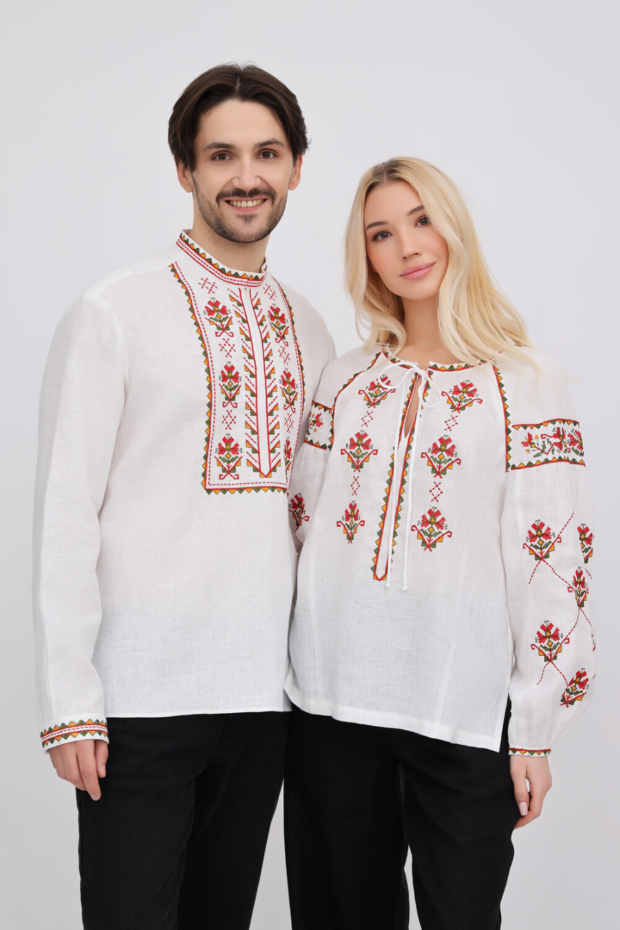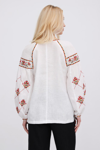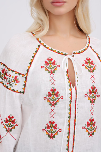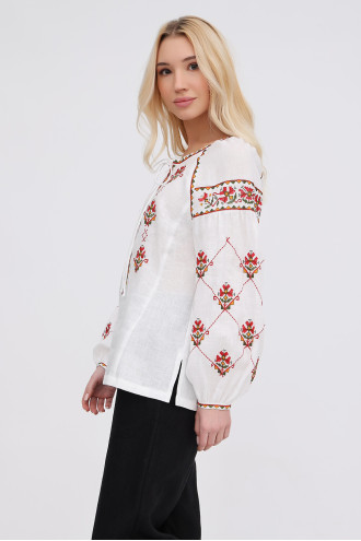 Изысканная современная вышиванка из тонкого натурального льна белого цвета с красочным орнаментом-декором. Модель свободного фасона с округлой горловиной со сборками, вырезом с завязками, просторными длинными рукавами-реглан с притачными манжетами на застежке, выточками на груди и рельефами швов, шлицами в боковых швах. Рукава и полочка украшены растительным орнаментом гладью. Вышиванка подчеркнет плавность и женственность фигуры, придаст образу нарядность и загадочность. Наряд будет уместен для любого события, а в сочетании с мужской вышиванкой Мирон создаст стильный парный образ.