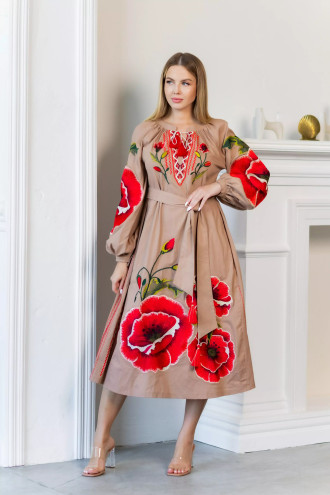 Нарядное светло-кофейное длинное вышитое платье из смессовой натуральной ткани с ярким многоцветным вышитым орнаментом. Модель свободного фасона с округлой горловиной со сборками, неглубоким вырезом декольте с завязками-кисточками, длинными пышными рукавами-реглан с манжетами на застежке, просторной юбкой с карманами на уровне бедер, поясом из основной ткани с кисточками. Полочка, рукава и юбка декорированы крупными красочными маками гладью, манишка и боковые швы - геометрическим орнаментом. Платье придаст праздничному образу изысканность и элегантность, подчеркнет хрупкость и красоту фигуры. Наряд будет уместен для любых торжеств и сочетается как с классическими украшениями, так и с ожерельями в стиле этно.
