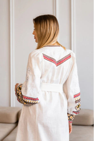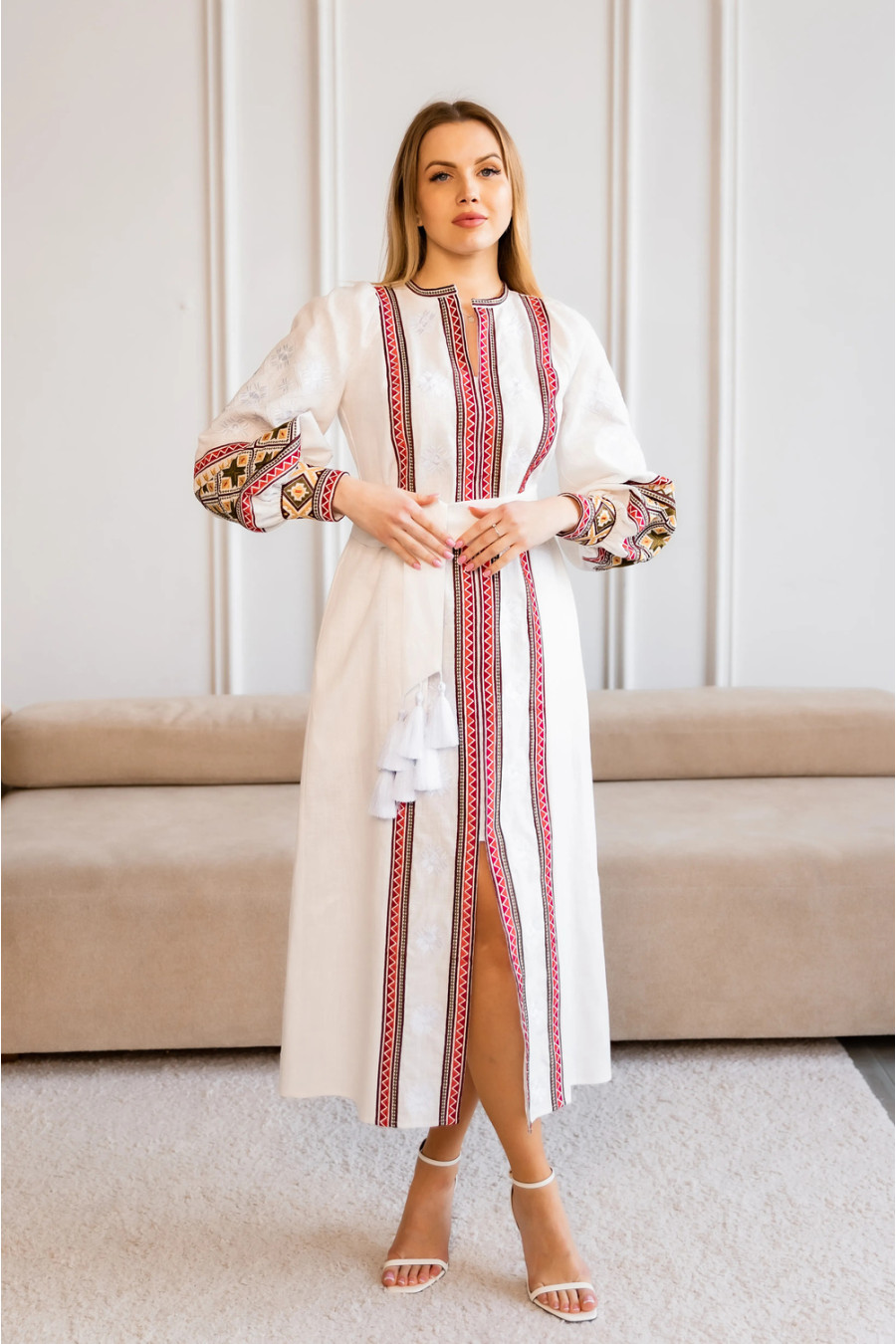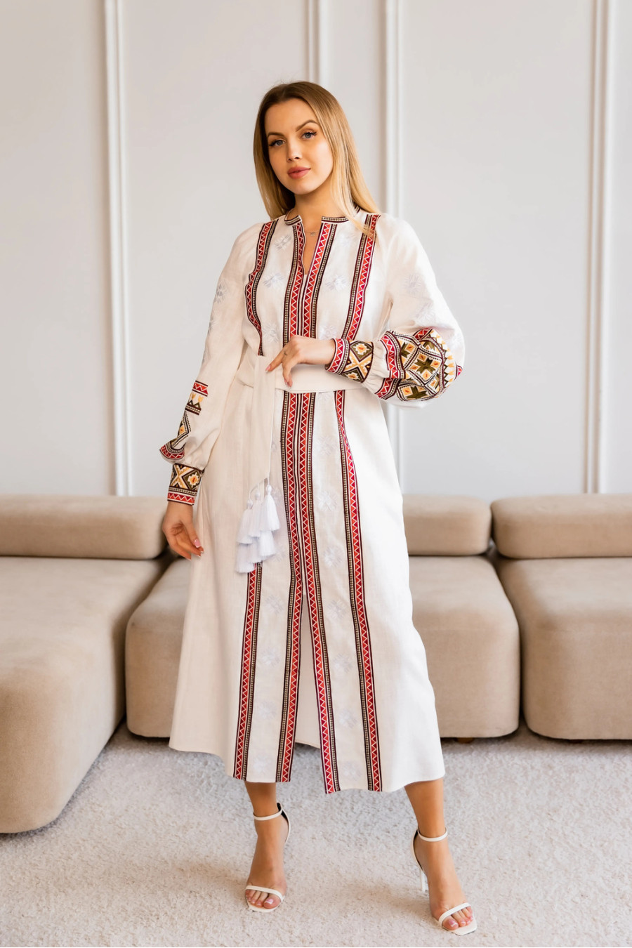 Кремово-белое вышитое длинное платье из приятного к телу смессового льна с контрастным многоцветным вышитым декором. Модель свободного покроя с округлой горловиной, V-образным вырезом декольте, просторными длинными втачными рукавами с высокими манжетами на застежке, глубокой шлицей впереди, длинным съемным поясом из основной ткани с кисточками. Изделие украшает красочный геометрический орнамент в оливково-бежево-красной гамме и белоснежные снежинки гладью. Платье придаст девичьему образу романтичность и очарование, подчеркнет женственность и красоту форм. Наряд будет уместен в праздничном гардеробе любой барышни.