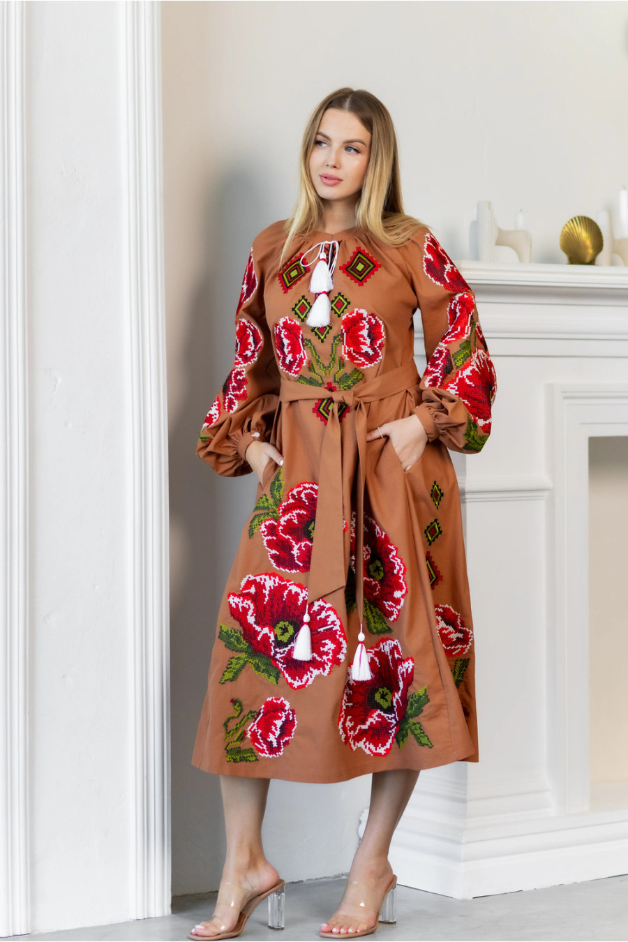 Терракотово-кирпичное длинное вышитое платье из смессовой льняной ткани с красочным вышитым декором, которое придаст образу теплых красок. Модель свободного силуэта с округлой горловиной со сборками, вырезом с завязками-кисточками, пышными длинными рукавами-реглан с манжетами на застежке, просторной юбкой с карманами на уровне бедер, съемным поясом из основной ткани с кисточками. Рукава, полочка и юбка украшены крупными красными маками и геометрическим орнаментом-ромбами. Платье дополнит праздничный образ, подчеркнет его очарование и загадочность. Наряд украсит гардероб любой модницы и удачно сочетается с разнообразными аксессуарами.