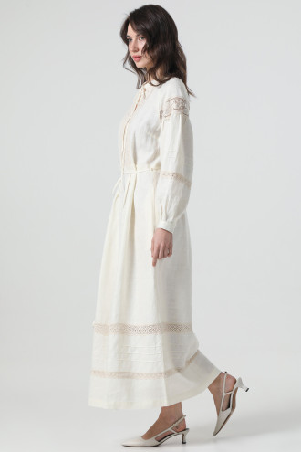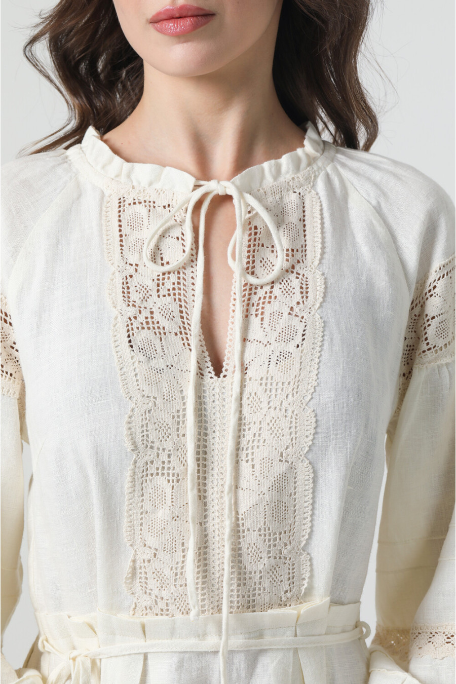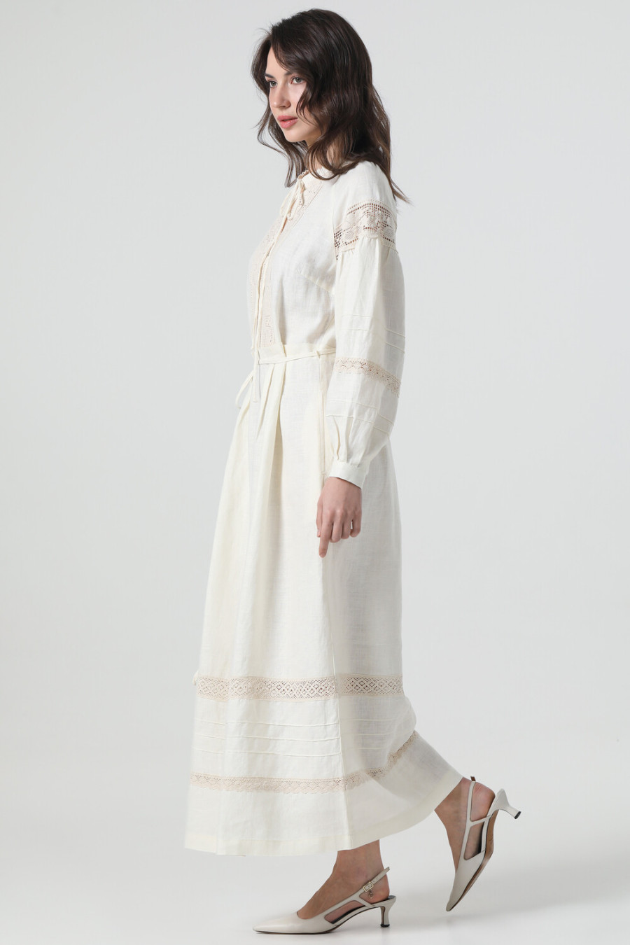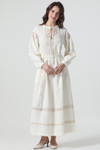Длинное льняное платье из натуральной ткани молочно-кремового цвета с кружевным кремово-бежевым декором. Модель свободного фасона с округлой горловиной с рюшем, неглубоким вырезом с завязками, просторными длинными рукавами-реглан с притачными манжетами на застежке, отрезной юбкой с защипами и сборками, карманами на уровне бедер, узким пояском-шнурком в тон ткани. Полочка декорирована мережкой с цветочным рисунком, рукава и юбка - ажурным кружевом. Платье придаст образу очарование и загадочность, подчеркнет хрупкость форм. Наряд станет прекрасным вариантом для любого торжественного события.