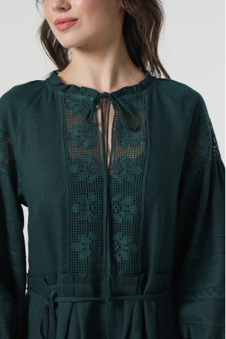 Элегантное темно-изумрудное длинное платье из натурального льна с кружевным декором в тон ткани. Модель свободного фасона с округлой горловиной с рюшем, неглубоким вырезом с завязками, просторными длинными рукавами-реглан с притачными манжетами на застежке, отрезной юбкой с защипами и сборками, карманами на уровне бедер, узким поясом-шнурком из основной ткани. Полочка декорирована мережкой с цветочным рисунком, рукава и юбка - ажурным кружевом. Платье придаст образу очарование и загадочность, подчеркнет хрупкость форм. Наряд станет прекрасным вариантом для любого торжественного события.