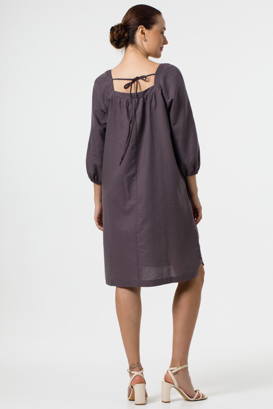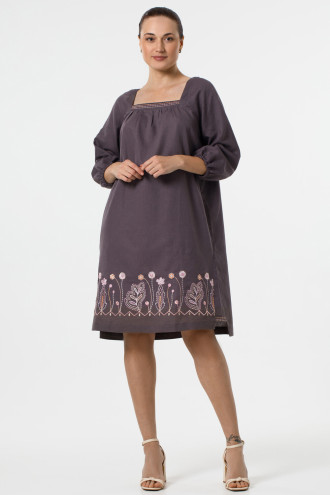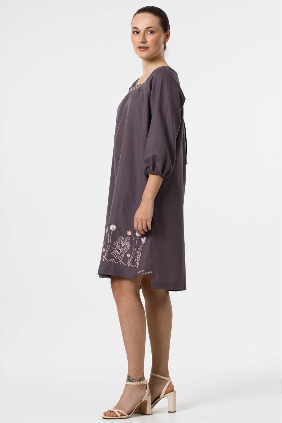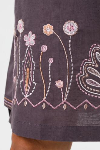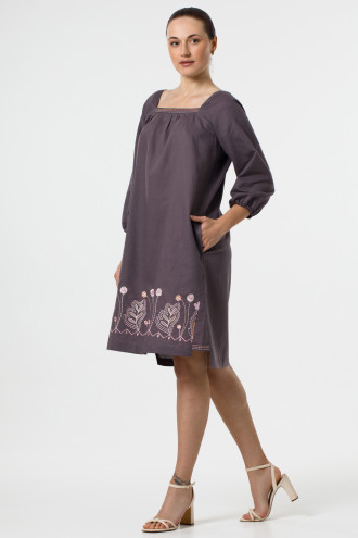 Оригинальное короткое вышитое платье из натурального льна цвета молочного шоколада с вышитым декором в бежево-розовой гамме. Модель свободного покроя с удлиненной спинкой, широкой горловиной-каре, фигурным вырезом с завязками на спинке, пышными рукавами-реглан 3/4 с манжетами-резинками, шлицами в боковых швах со вставками-драпировкой, карманами на уровне бедер, поясом-шнурком из основной ткани. Полочка и вставки декорированы орнаментом-полосками, подол - растительным орнаментом гладью. Платье подарит ощущение свободы движения и прохлады, придаст образу женственность и шарм. Наряд будет уместен и в повседневном легком, и в праздничном гардеробе.