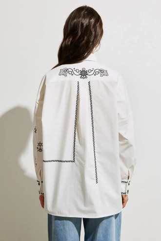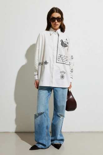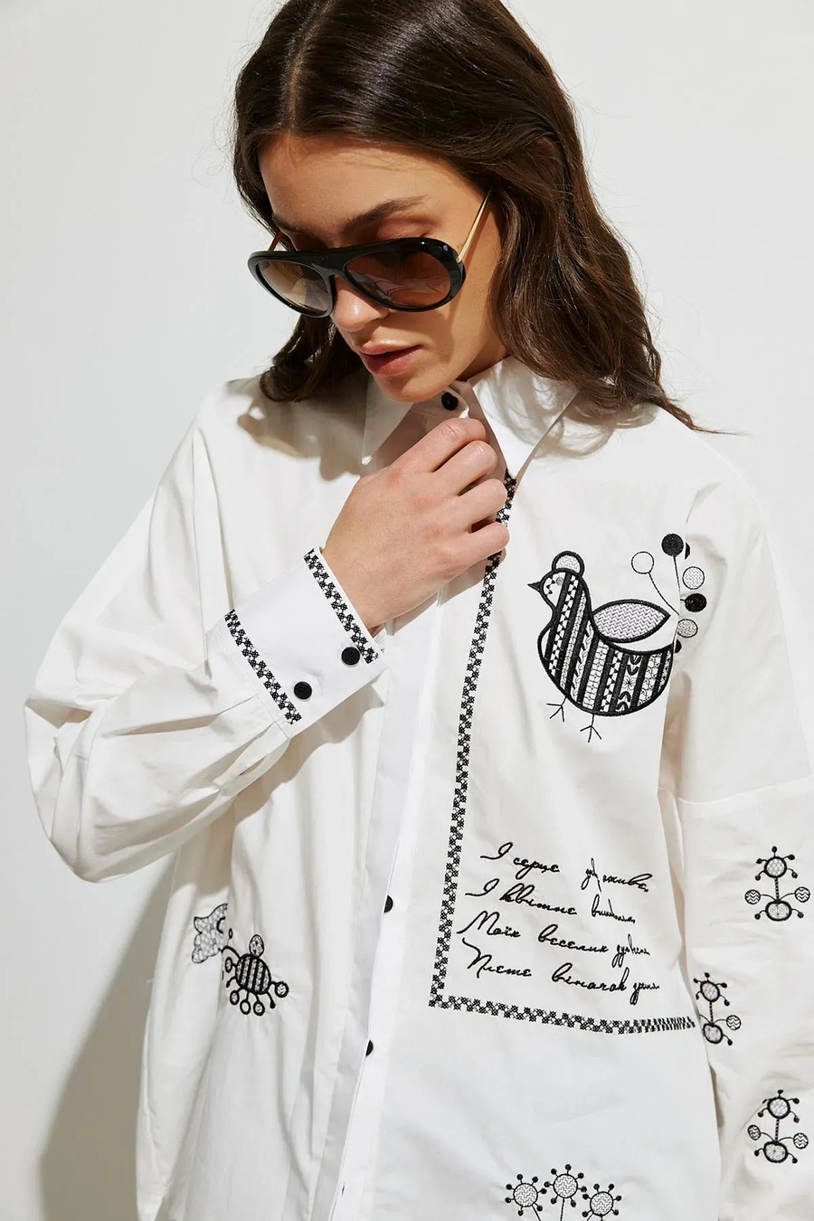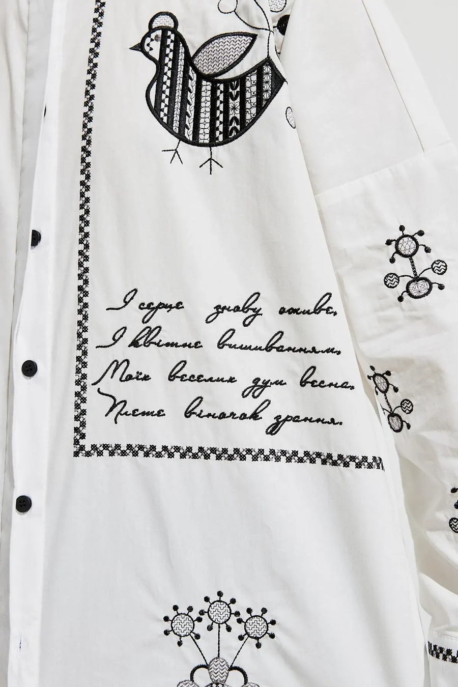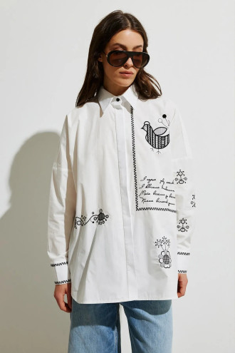 Хлопковая рубашка «Украинская пава» предназначена для тех, кто ценит комфорт в сочетании с оригинальными и символическими вышитыми акцентами. Изготовлена из плотной, натуральной ткани, которая хорошо держит форму и дышит. Модель имеет классический воротник, четкую планку, придающую изделию аккуратный и завершенный вид. На спинке присутствует кокетка и складка, которые придают легкую фактурность. Орнамент выполнен в виде сочетания фигурных мотивов и геометрических форм, придает характер и служит акцентным аксессуаром. Уникальная деталь – авторское стихотворение, придающее рубашке особого шарма.