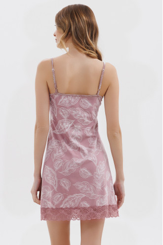 Трикотажная ночная рубашка до колен из натуральной хлопковой ткани цвета темно-розовой пудры с бело-кремовым принтом-листочками с ажурным кружевом в тон ткани. Модель полуприлегающего покроя с глубоким вырезом декольте, отрезным двойным фигурным лифом с перекрутом, узкими регулируемыми шлеями, широкой кружевной вставкой на подоле. Рубашка дополнит домашний гардероб, придаст образу утонченность и нежность.