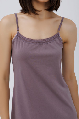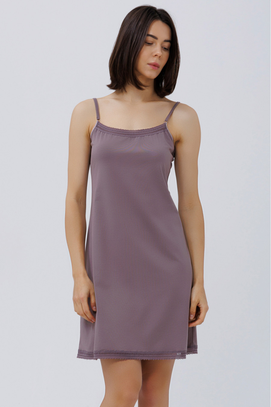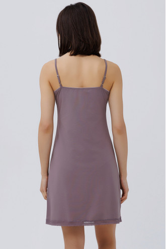 Комфортная летняя ночная рубашка до колен из мягкой хлопковой ткани цвета темно-фиолетовой сирени с кружевом-тесьмой в тон ткани. Модель полуприлегающего фасона с округлым вырезом декольте с тесьмой, узкими регулируемыми шлеями, кружевным декором на подоле. Рубашка подчеркнет хрупкость и стройность форм, придаст девичьему образу элегантность. Наряд украсит домашний гардероб, а при желании его можно дополнить одноименным халатом.