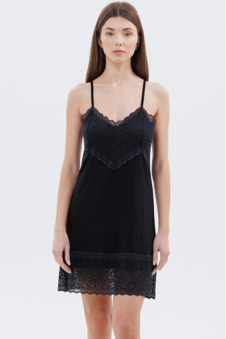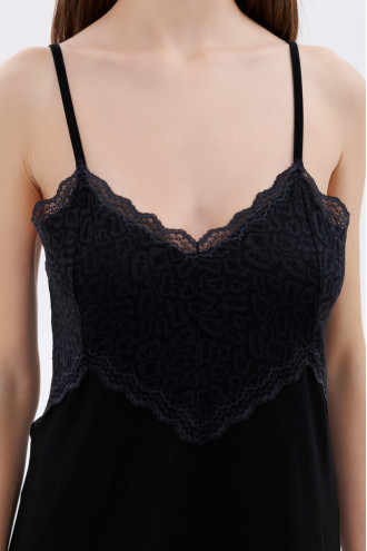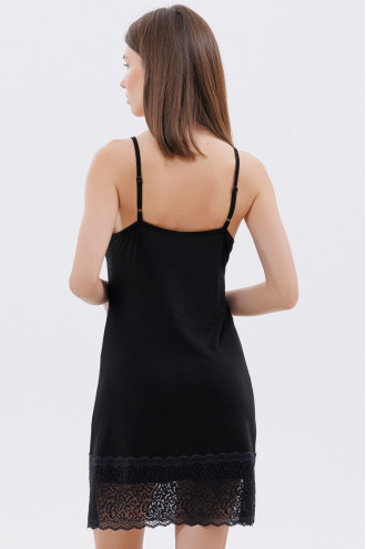 Элегантная трикотажная ночная рубашка до колен из вискозной ткани черного цвета с широким ажурным кружевом в тон ткани, которая подарит ощущение комфортной свободы. Модель полуприлегающего силуэта с глубоким V-образным вырезом декольте с фигурной ажурной драпировкой-нашивкой, узкими регулируемыми шлеями, широкой кружевной вставкой на подоле. Рубашка подчеркнет стройность и женственность фигуры, придаст домашнему образу таинственность.