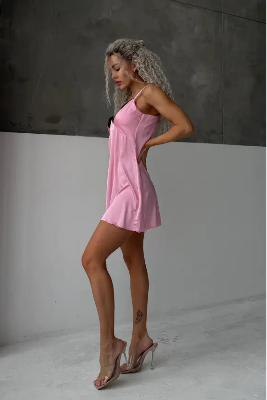 Соблазнительная ночная рубашка «Софи» розового цвета украшена черным кружевом по краю декольте. Силуэт – приталенный, короткий. Без рукавов на регулируемых бретельках. Верхняя часть смоделирована по типу лифа. Изготовлена из шелка, который приятен к телу и хорошо драпируется, подчеркивая женские изгибы и формы. Материал не сминается, прочный, имеет приятный матовый блеск.