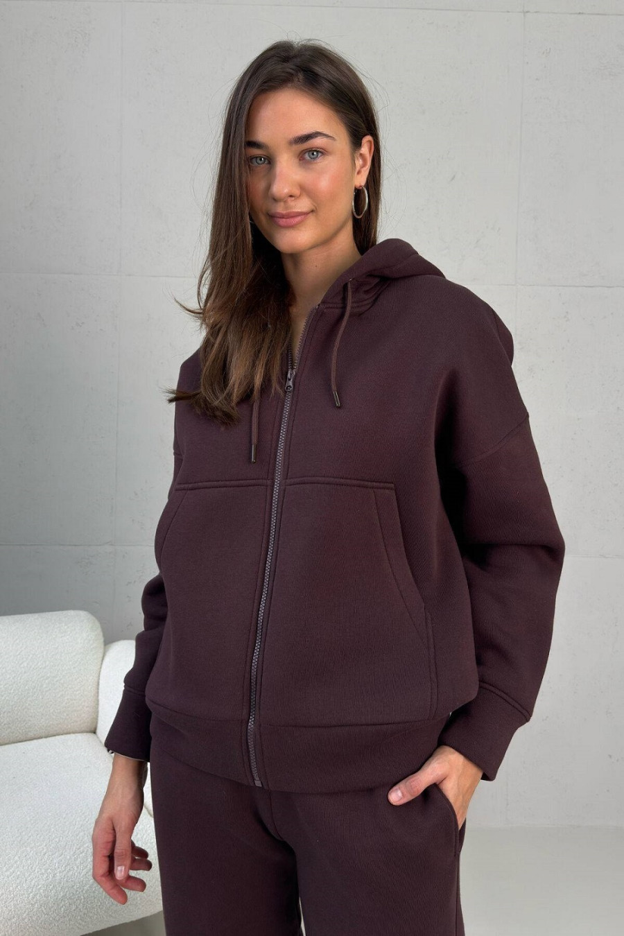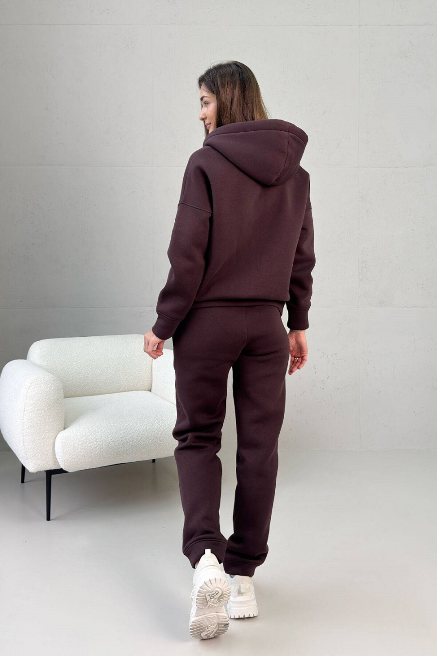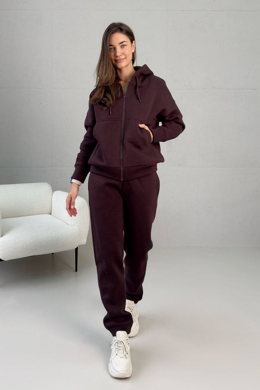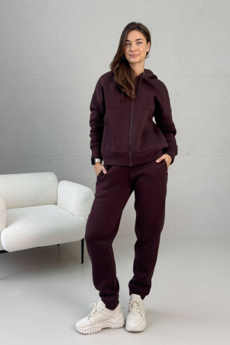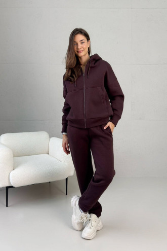 Спортивный костюм "Николь" шоколадного цвета изготовлен из тринитки на флисе. Гладкая наружная сторона ткани и ворсистая внутренняя обеспечивают износостойкость одежды, цветостойкость, легкость ухода и сохранение тепла. Кофта застегивается на молнию. Украшена капюшоном и карманами-кенгуру. Рукав посаженный на спущенную линию плеча за счет чего кофта хорошо садится на любую фигуру. Брюки на резинке слегка заужены. Имеют два втачных кармана. Низ фиксируется на голени манжетой-резинкой.