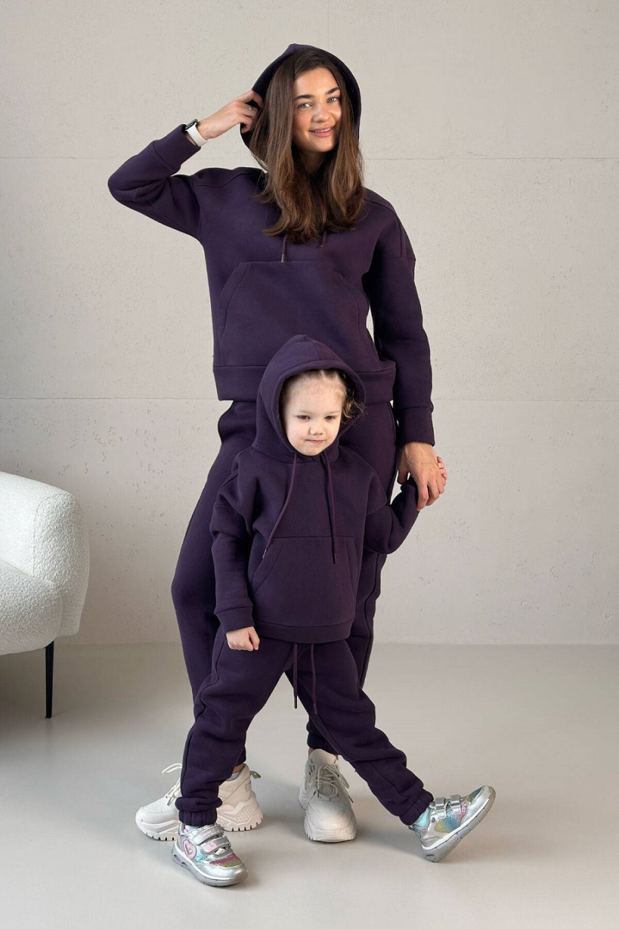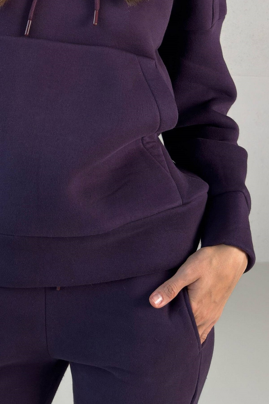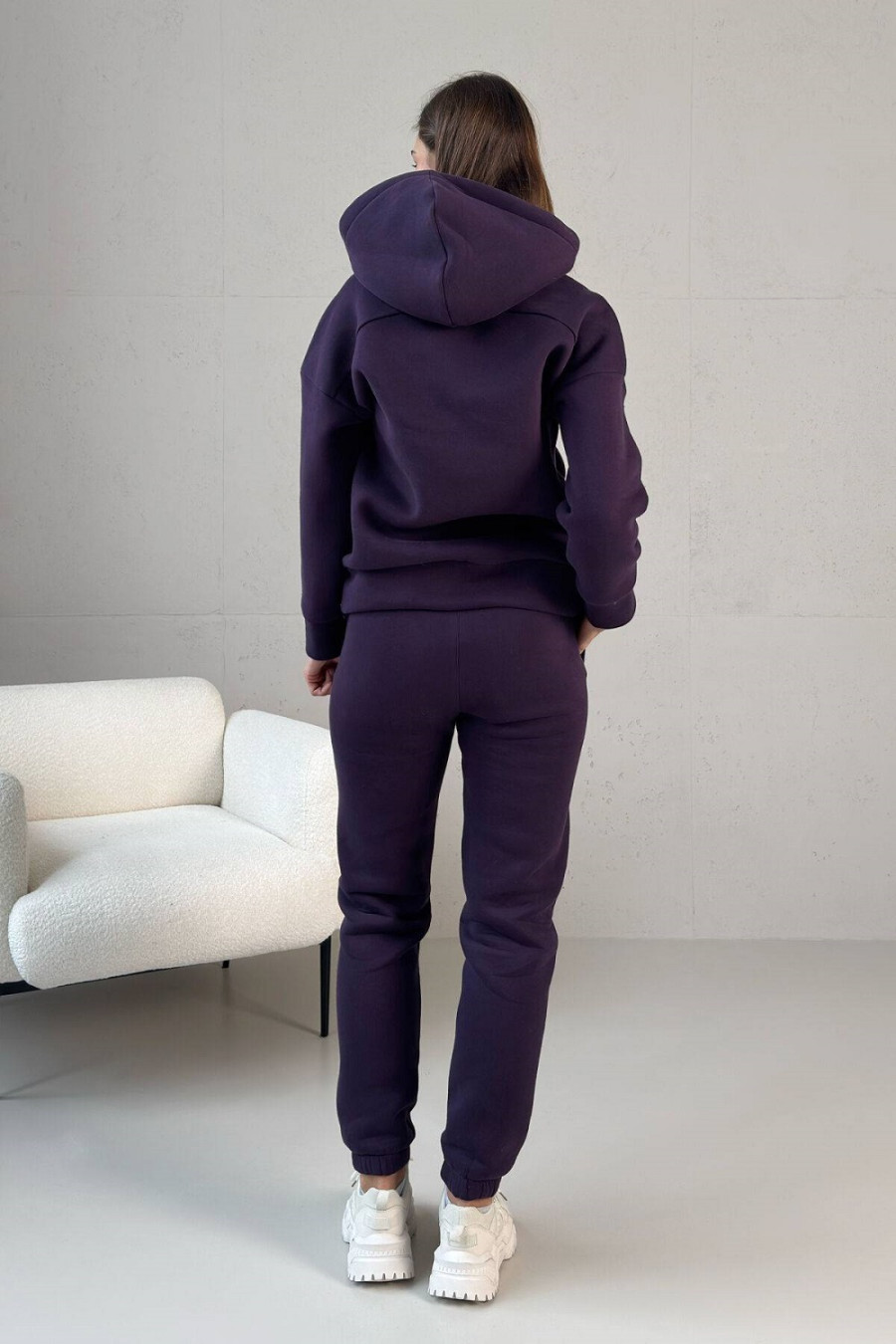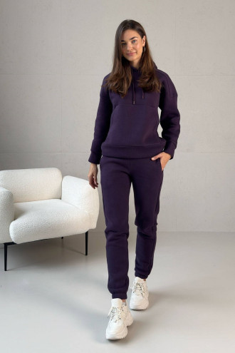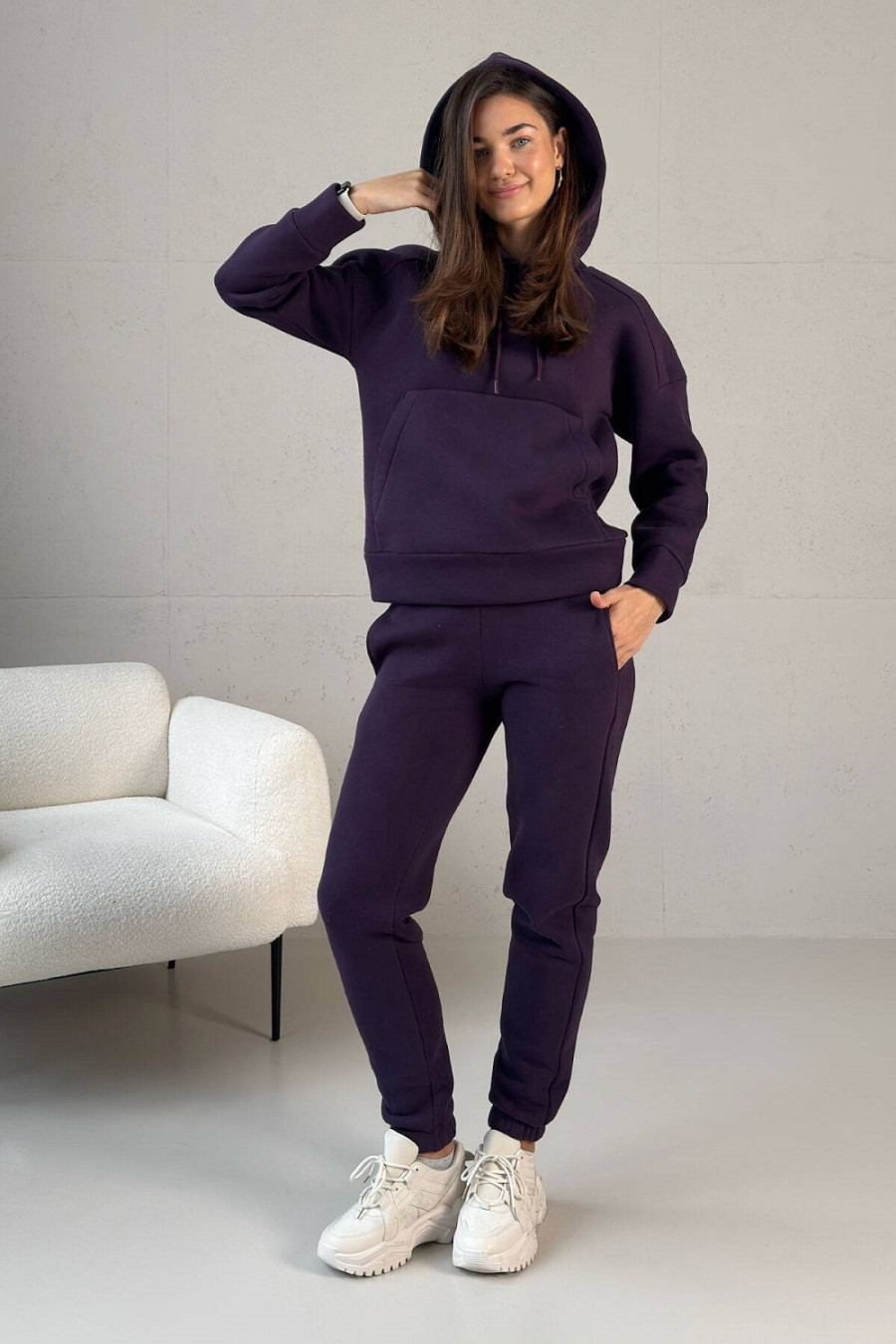 Спортивный костюм «Фоллия» фиолетового цвета изготовлен из тринитки на флисе. Гладкая наружная сторона ткани и ворсистая внутренняя обеспечивают износостойкость одежды, цветостойкость, легкость ухода и сохранение тепла. Свитшот украшен капюшоном и карманом кенгуру. Рукав посаженный на спущенную линию плеча за счет чего кофта хорошо садится на любую фигуру. Брюки на резинке слегка заужены. Имеют два втачных кармана. Низ фиксируется на голени манжетой-резинкой.