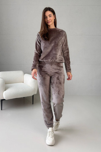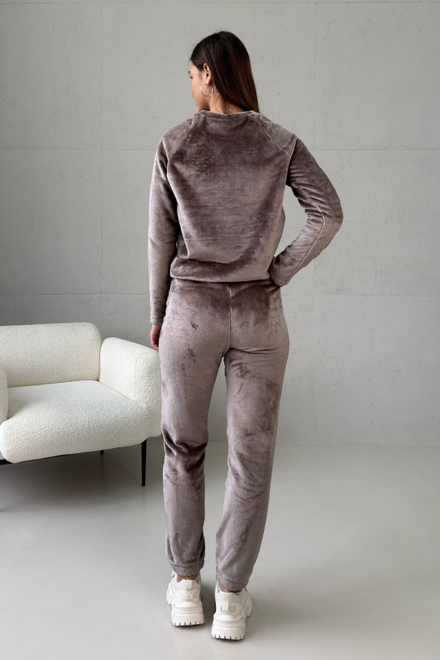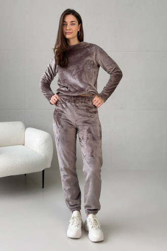 Спортивный костюм «Сиера» цвета мокко изготовлен из искусственного меха с высоким содержанием хлопка. Ворсистая ткань приятно переливается, придавая образу женственности и обольстительности. Верх комплекта – это свитшот с округлой горловиной, рукавами регланом и низом на резинке. Низ – слегка облегающие штаны прямого кроя, с поясом на резинке. «Сиера» – костюм, в котором девушки чувствуют себя комфортно и стильно.