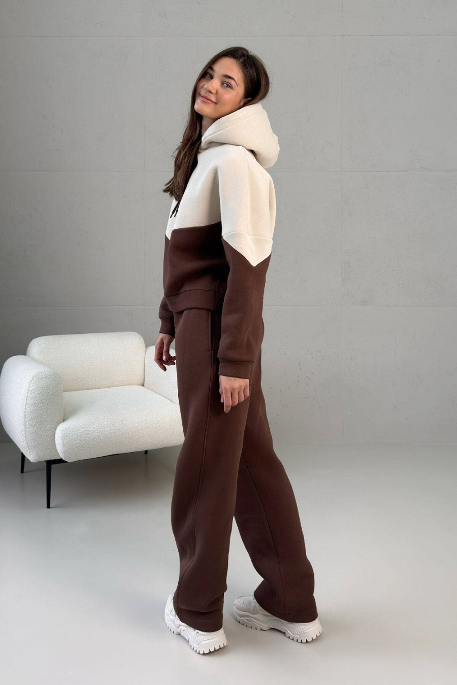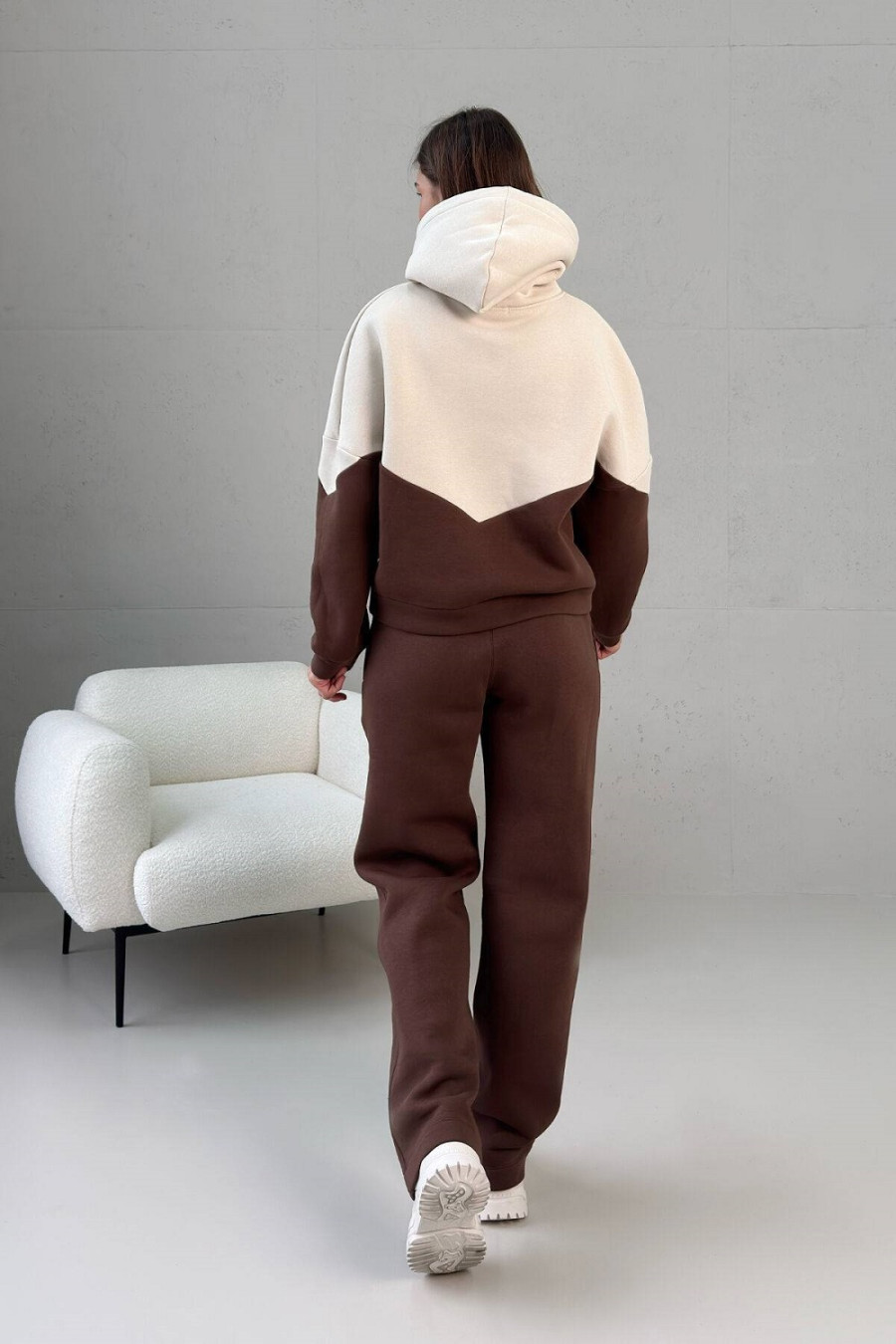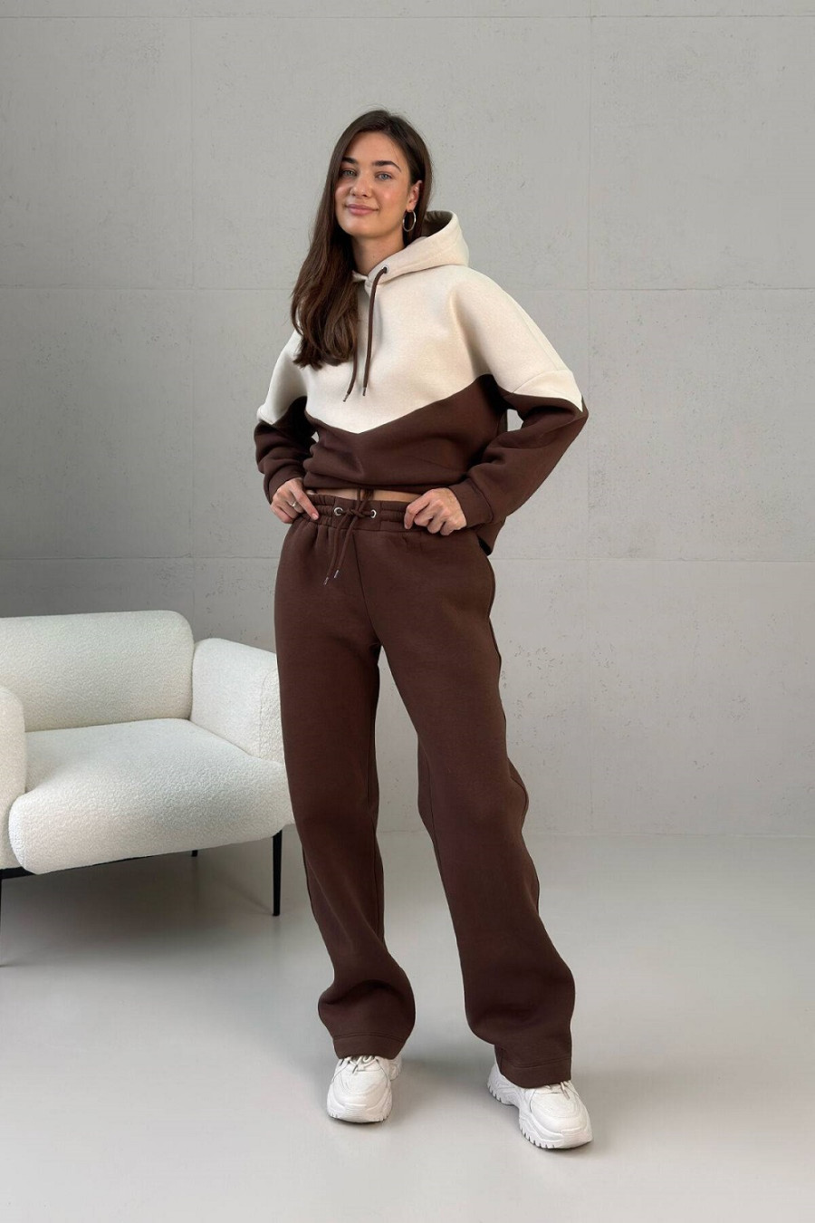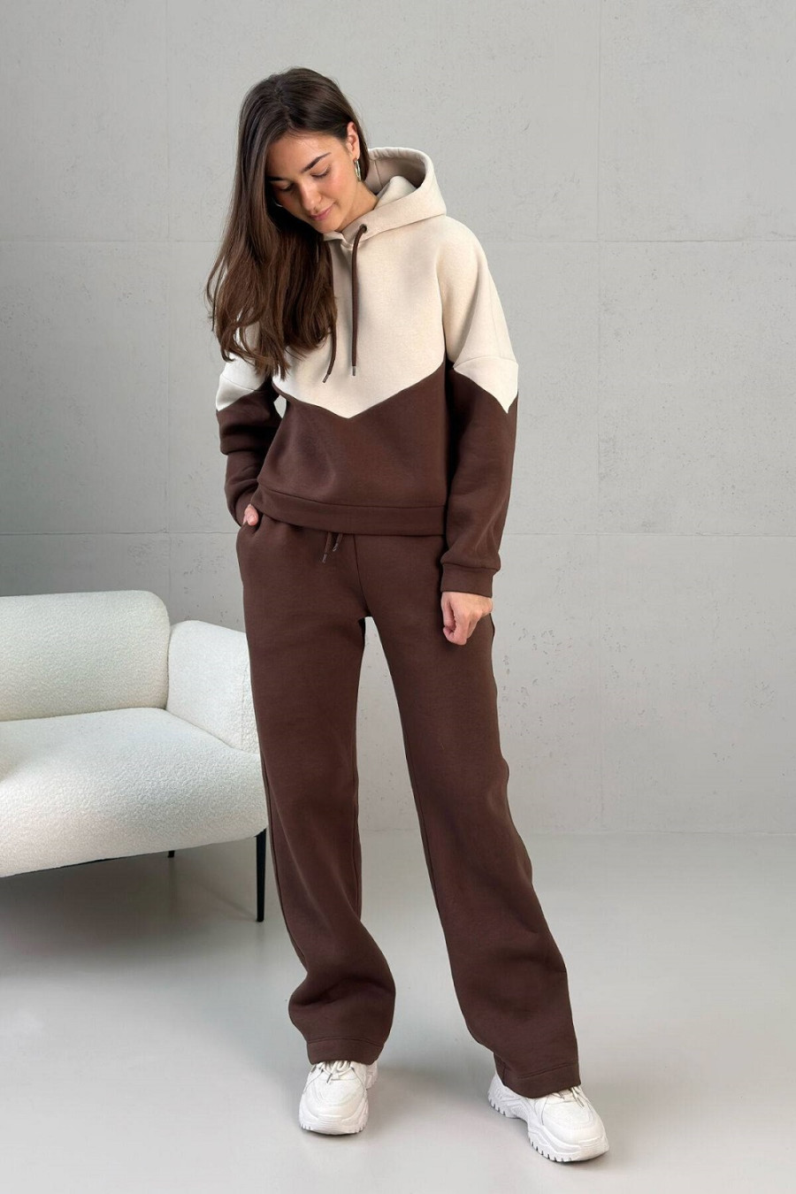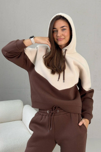 Спортивный костюм «Зодиак» сшит из тринитки на флисе, благодаря чему он теплый, мягкий, долго сохраняет цвет и быстро сохнет. Комплект привлекает внимание удачной комбинацией бежевой вставки на свитшоте в сочетании с коричневым низом. Верх украшен капюшоном на шнуровке. Рукав — втачной на манжете со спущенным плечом. Брюки прямые, классического силуэта с поясом-резинкой. На уровне бедер предусмотрены втачные карманы.