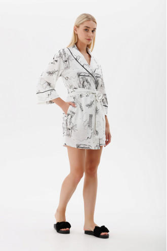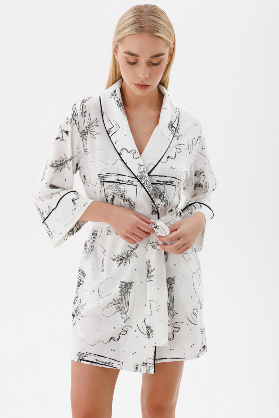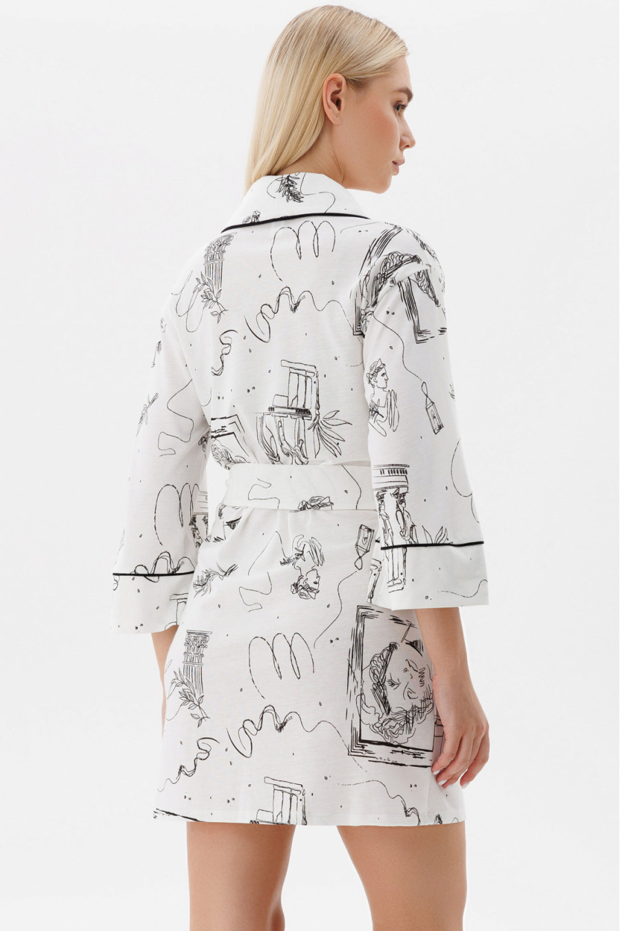 Короткий игривый халат на запах из натуральной смессовой ткани кремово-белого цвета с оригинальным черным принтом и декором-кантом. Модель свободного покроя с V-образным вырезом декольте с отложным воротничком-бейкой, приспущенной линией плеча, просторными рукавами с притачными манжетами с кантом, карманами на уровне бедер, поясом из основной ткани. Халат подчеркнет нежность и романтичность образа, подарит ощущение свободы и легкости после рабочего дня.