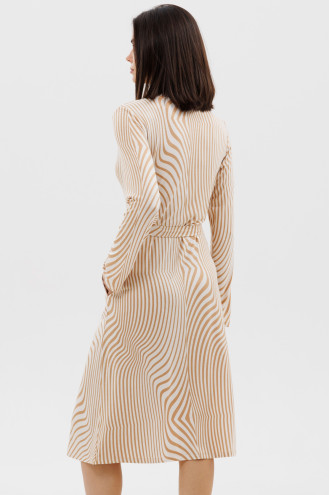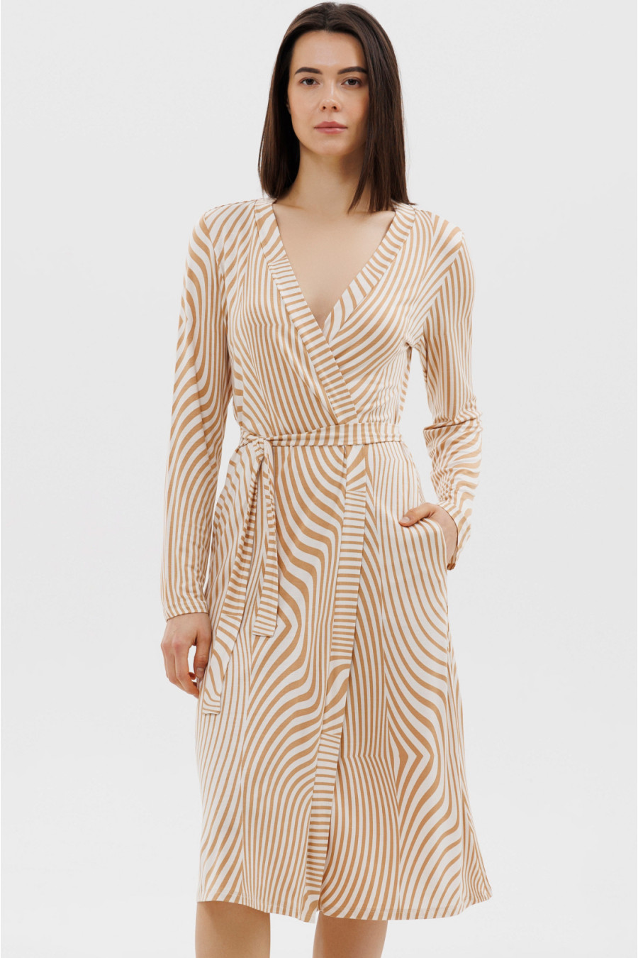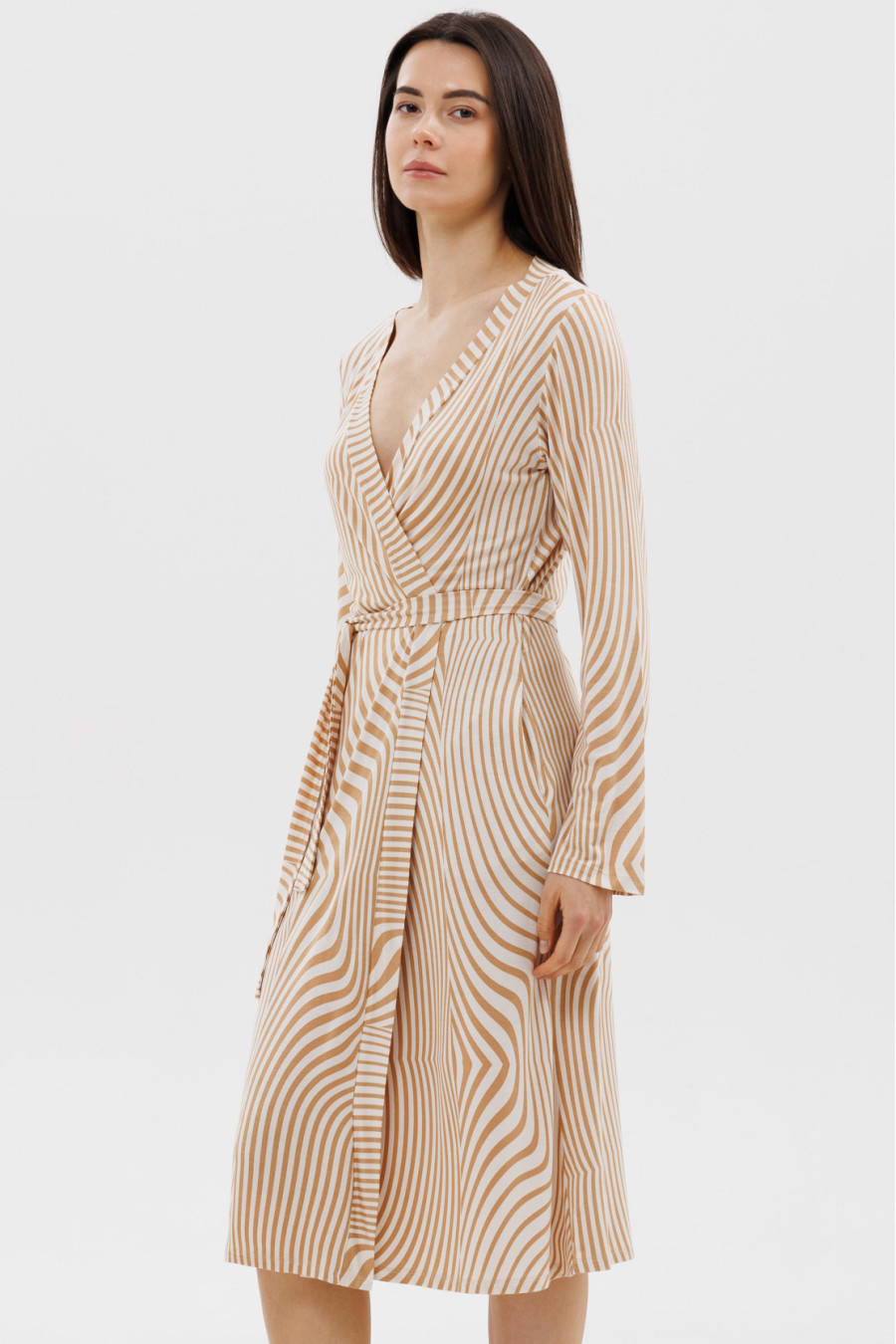 Полосатый трикотажный халат-миди на запах из вискозной ткани бежево-песочного и молочно-кремового цвета, который сделает утро уютным. Модель свободного фасона с глубоким V-образным вырезом декольте с притачной бейкой, приспущенной линией плеча, длинными рукавами без манжет, карманами на уровне бедер, длинным съемным пояском из основной ткани. Халат дополнит повседневный домашний гардероб, подчеркнет хрупкость силуэта.