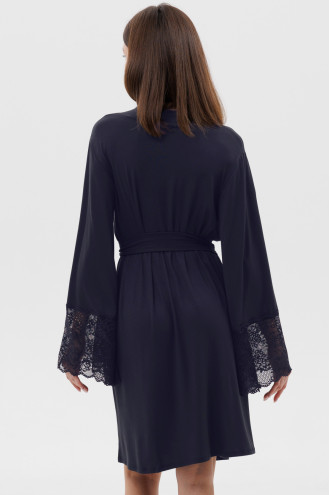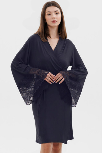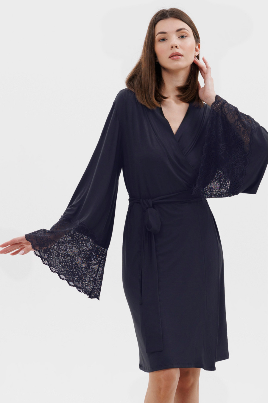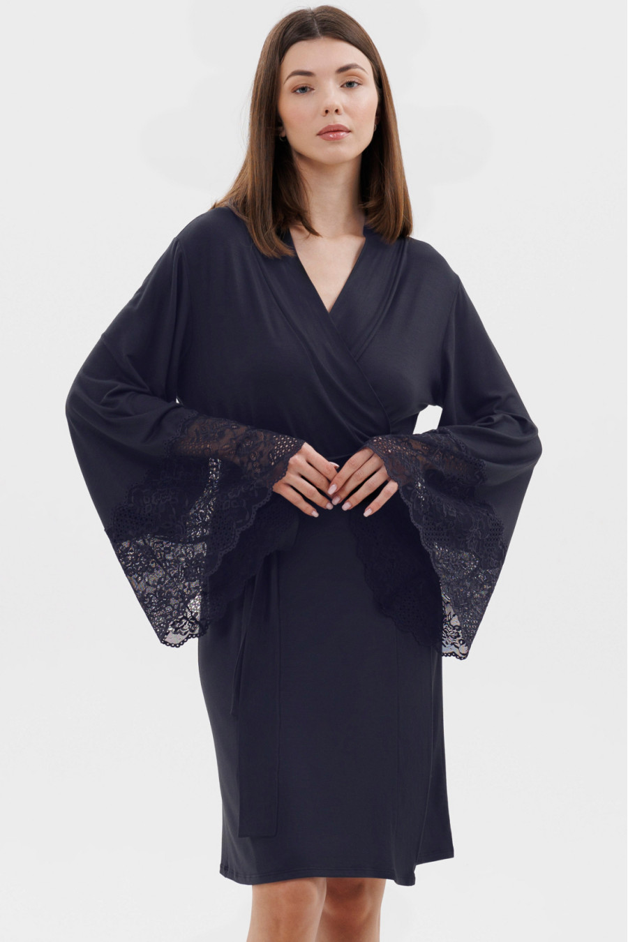 Изысканный трикотажный халат на запах из черной вискозной ткани с ажурным кружевом-декором в тон ткани, который подарит ощущение уюта. Модель свободного фасона с глубоким V-образным вырезом декольте с притачной бейкой, приспущенной линией плеча, длинными просторными рукавами-кимоно с широкими кружевными манжетами, поясом из основной ткани. Халат придаст образу загадочность и шарм, подчеркнет хрупкость форм.
