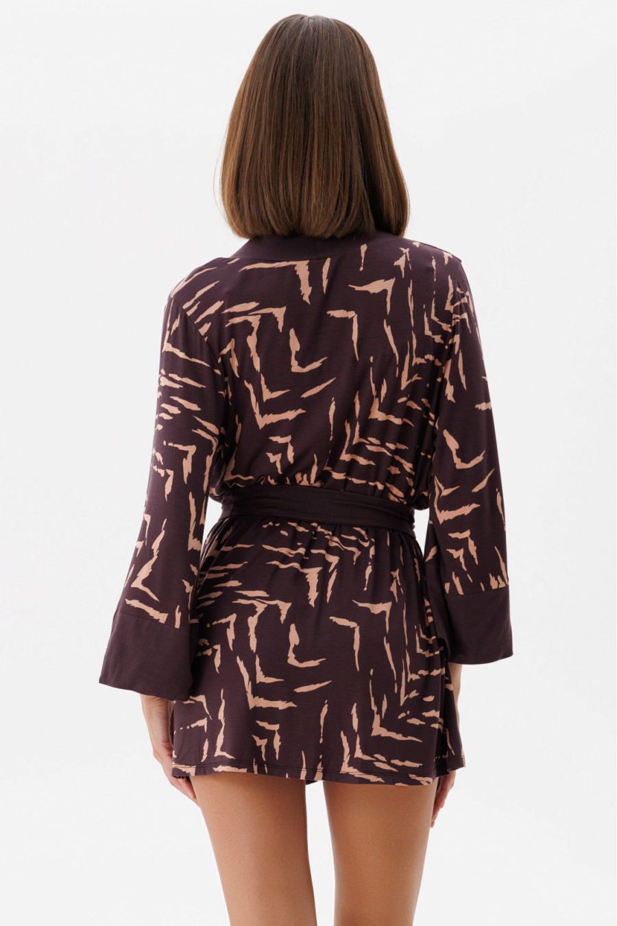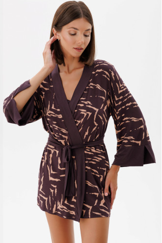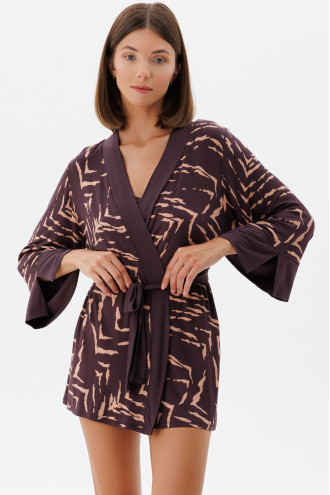 Темно-фиолетовый короткий халат на запах из вискозной трикотажной ткани с бежево-карамельным принтом-полосками и однотонными вставками-декором. Модель свободного фасона с глубоким V-образным вырезом декольте с притачной бейкой, приспущенной линией плеча, длинными просторными рукавами с манжетами со шлицами, пояском из однотонной ткани. Халат подчеркнет женственность образа, подарит ощущение свободы движения и легкости.