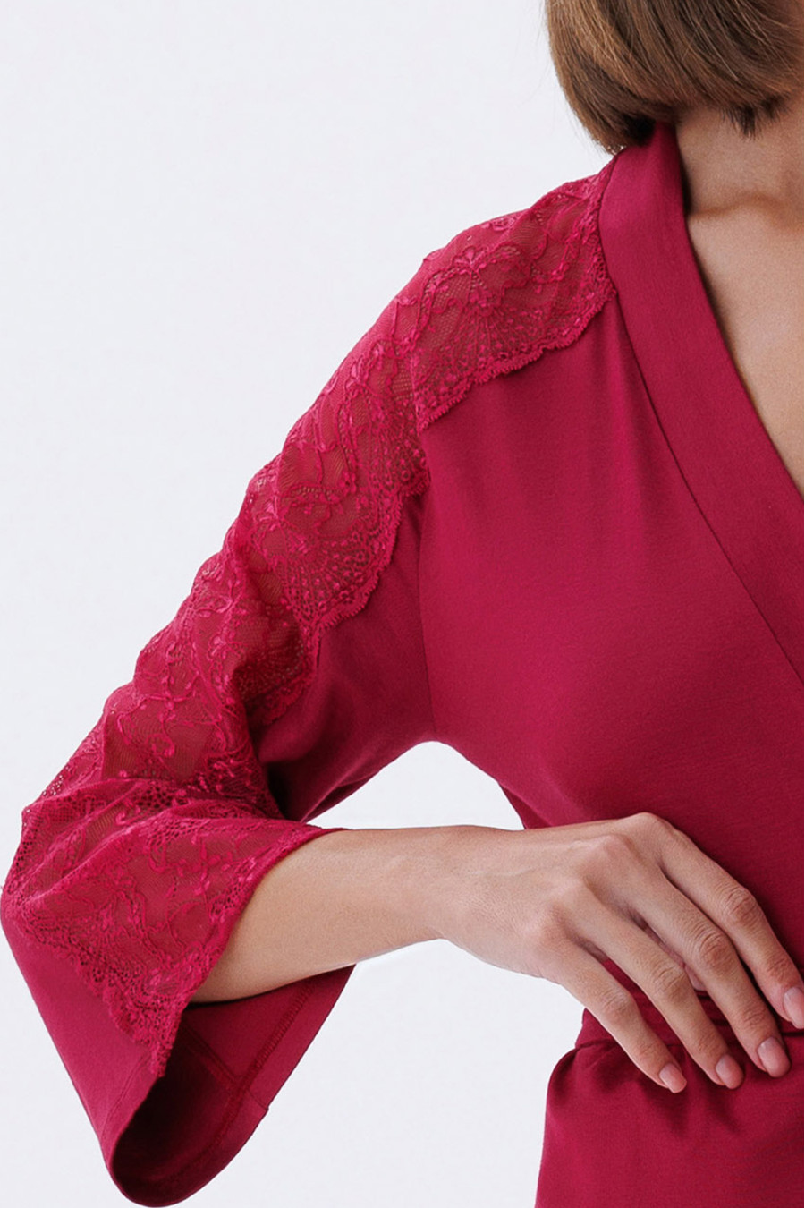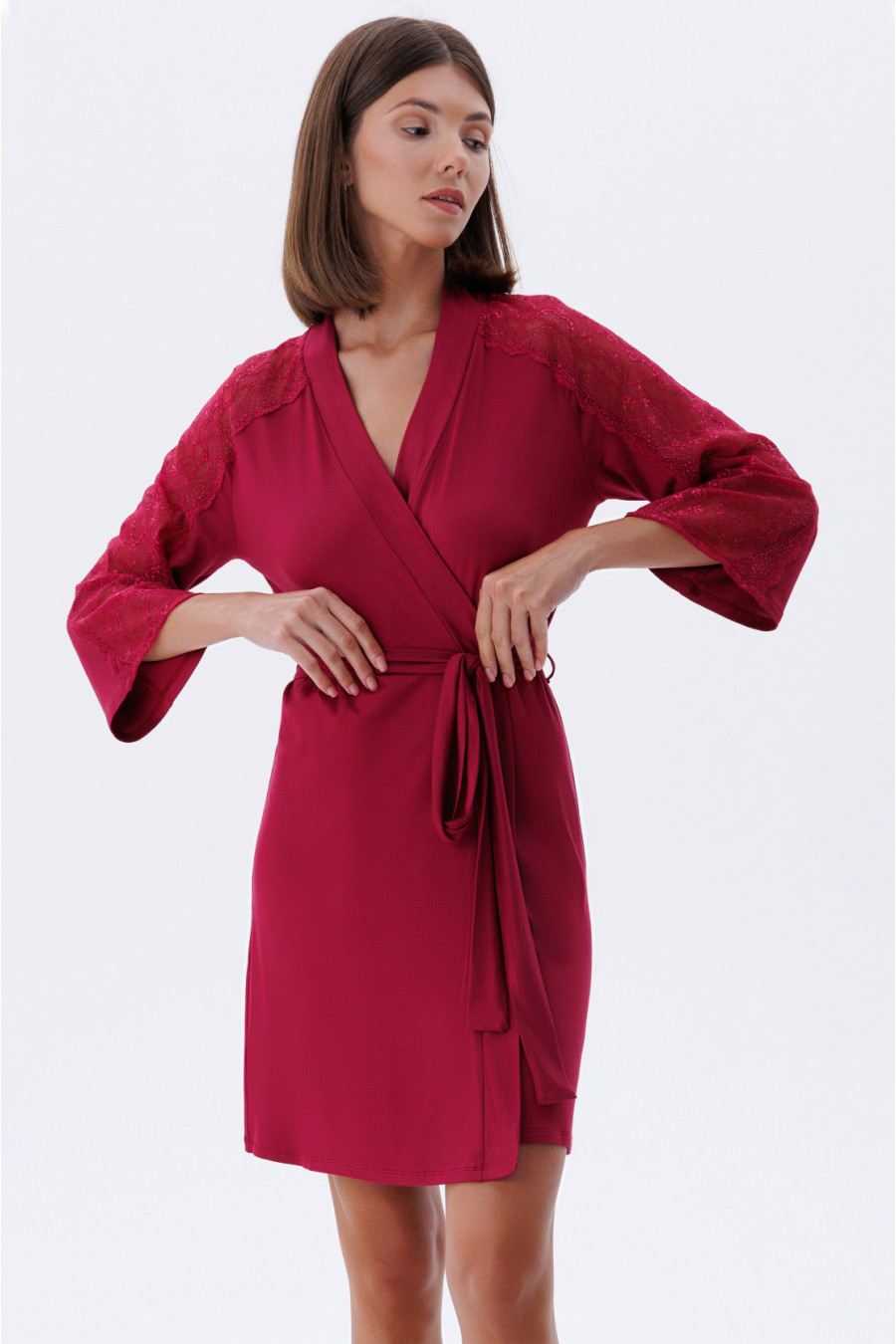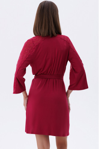 Очаровательный трикотажный короткий халат на запах из приятной на ощупь вискозной ткани бордово-винного цвета с кружевным декором-нашивками в тон ткани, который сделает даже хмурое утро уютным и приятным. Модель свободного силуэта с V-образным вырезом декольте с притачной бейкой, просторными рукавами-реглан 3/4 с кружевными нашивками, шлевками на талии, поясом из основной ткани. Халат придаст образу сочных красок и загадочность.